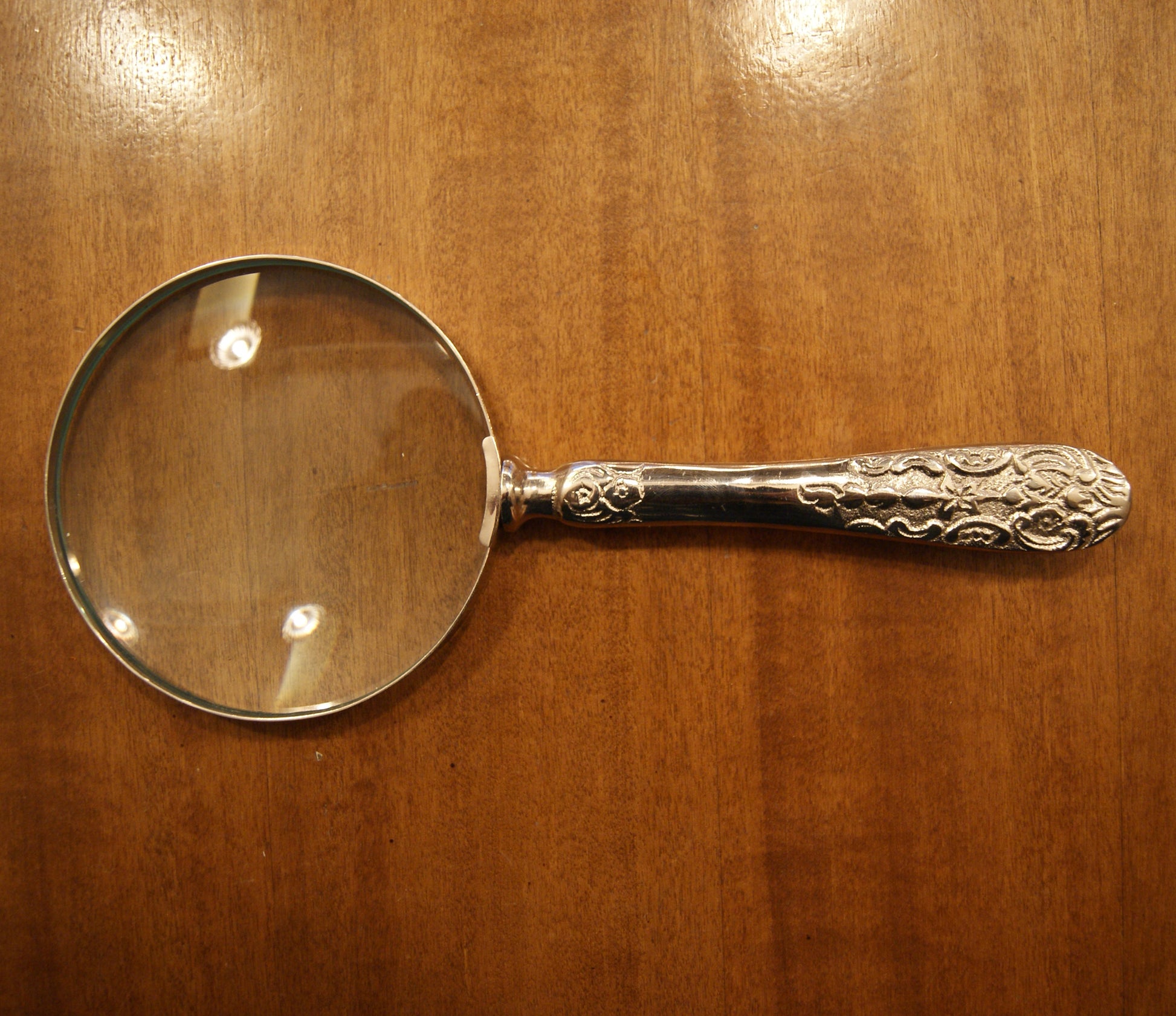 Lente d'ingrandimento con manico lavorato, realizzata a mano.