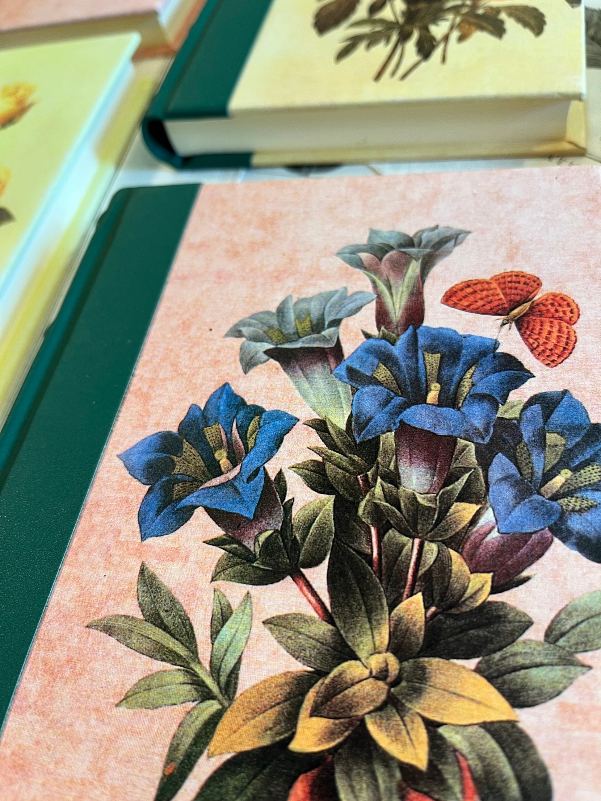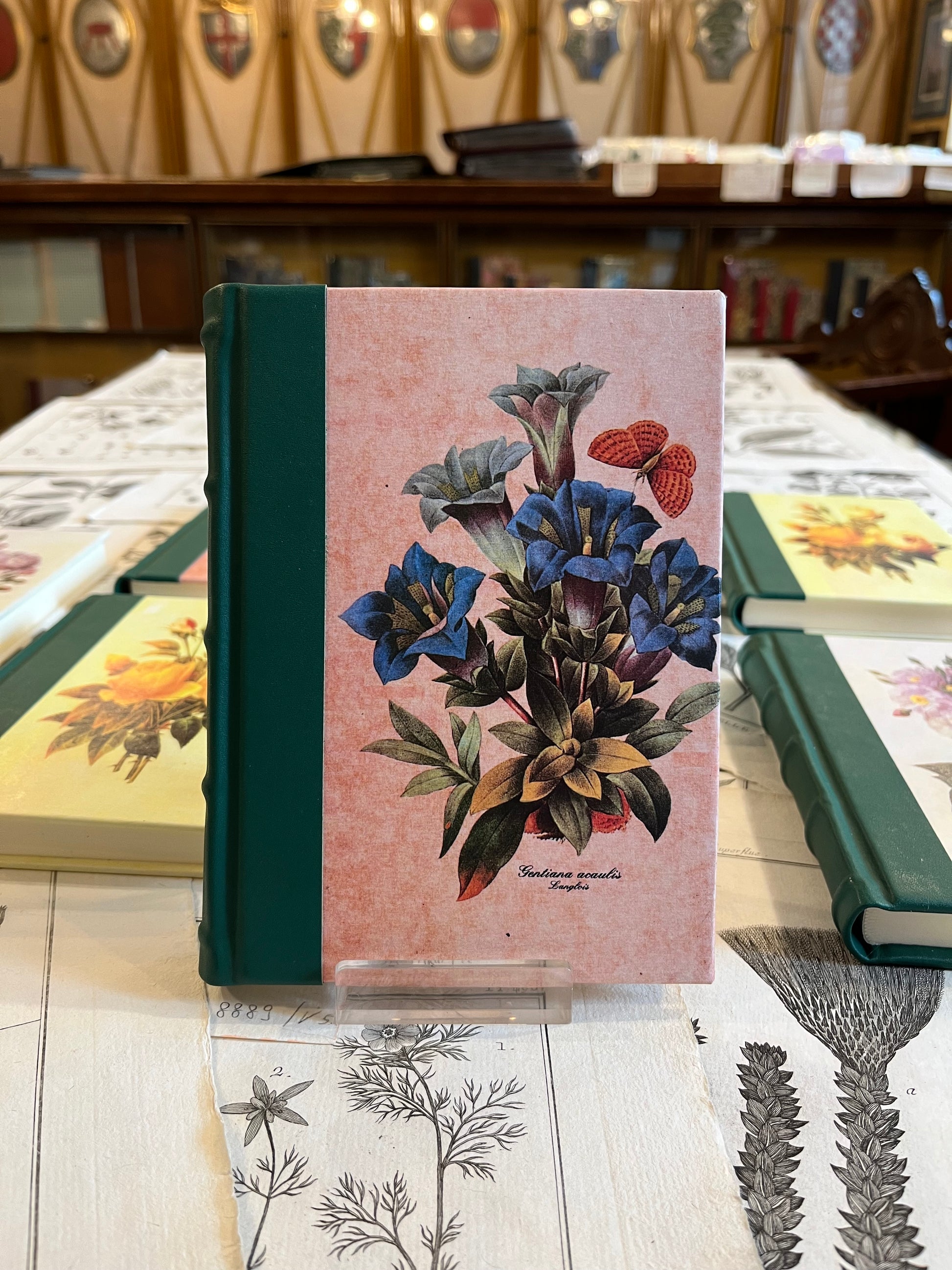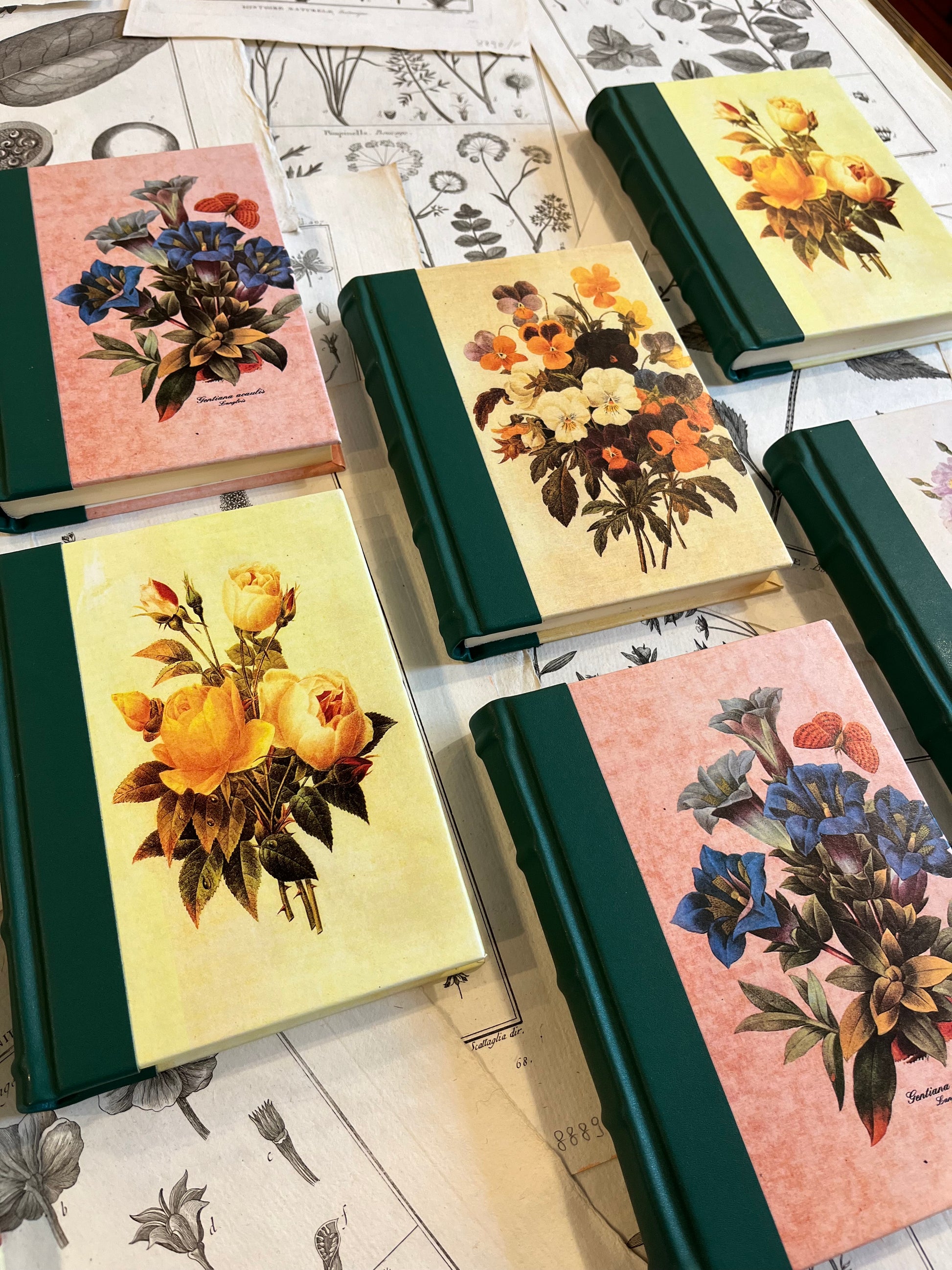 Copertina rigida con stampe floreali su fronte e retro, dorso in pelle italiana. Realizzato interamente a mano, 120 pagine a righe.