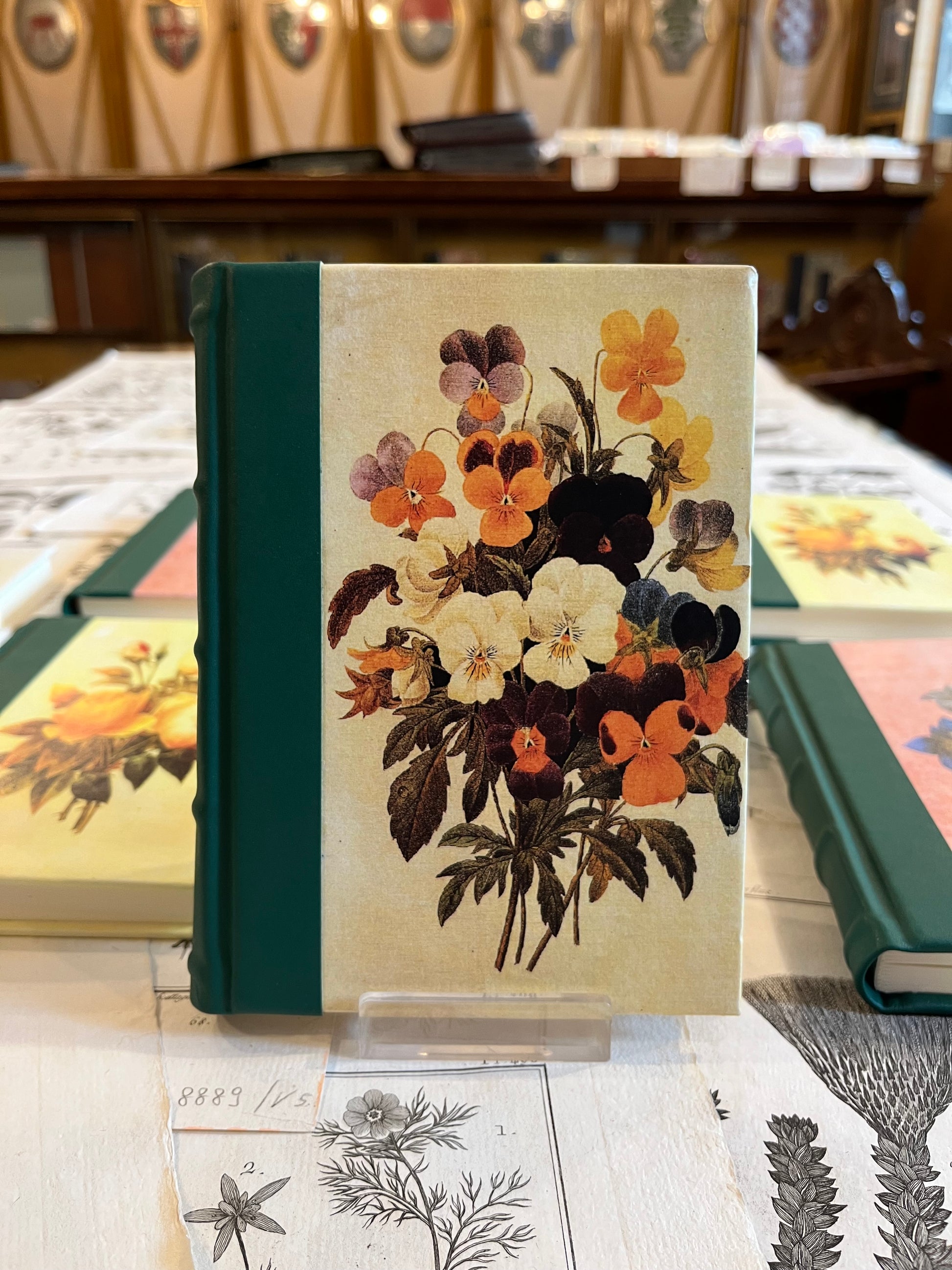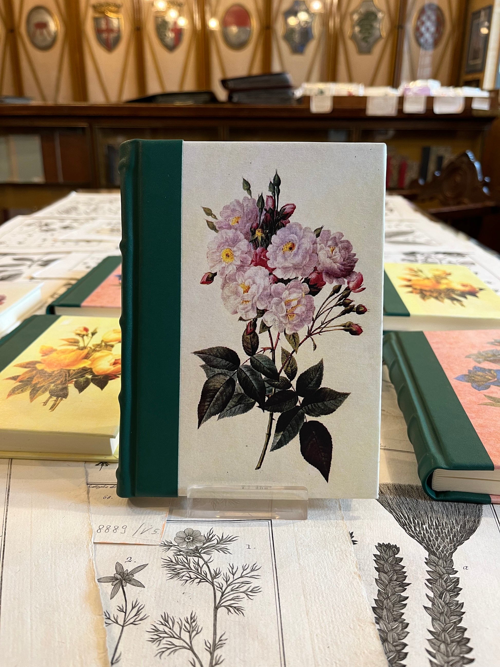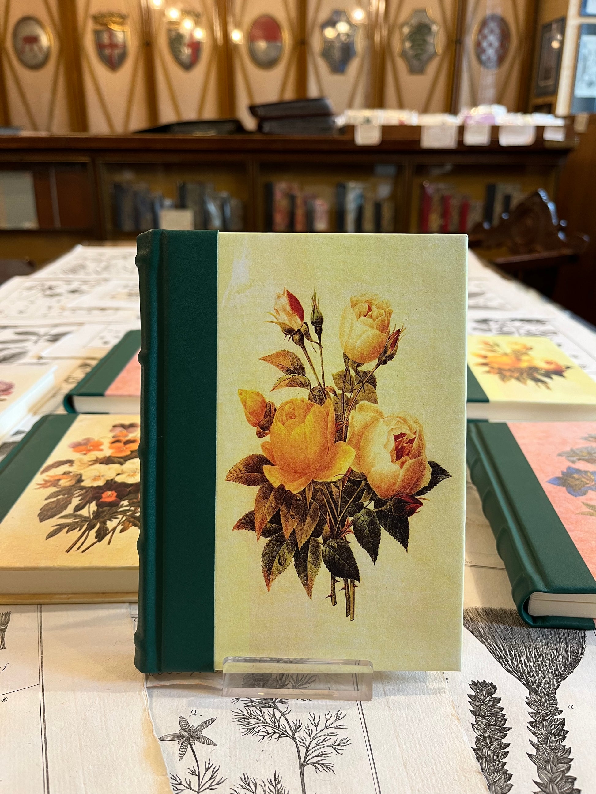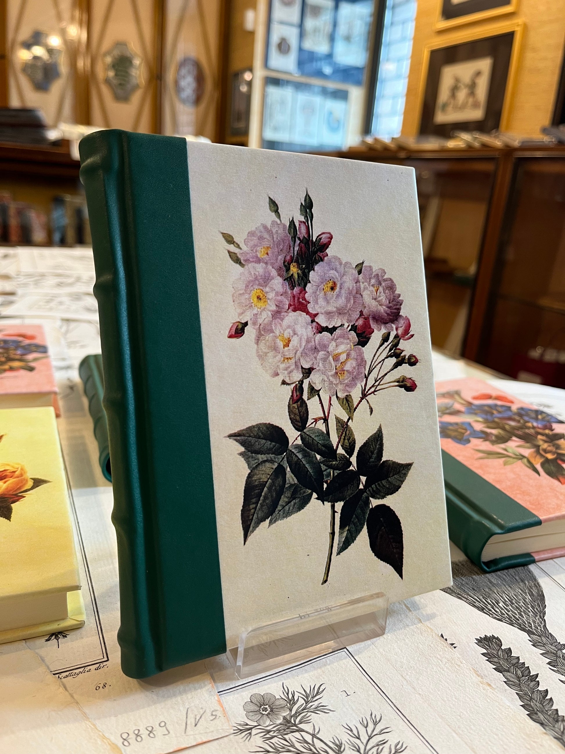 Copertina rigida con stampe floreali su fronte e retro, dorso in pelle italiana. Realizzato interamente a mano, 120 pagine a righe.