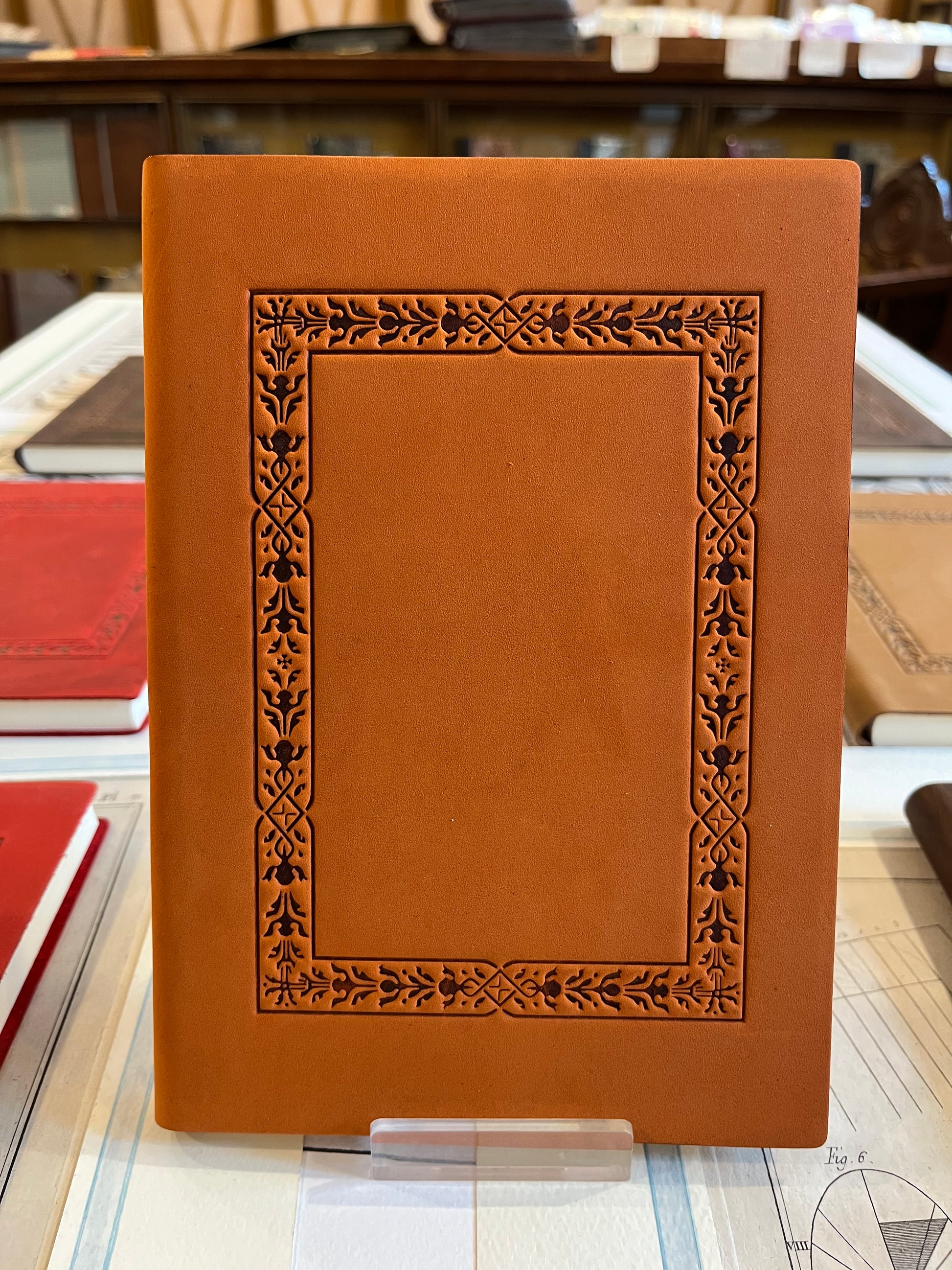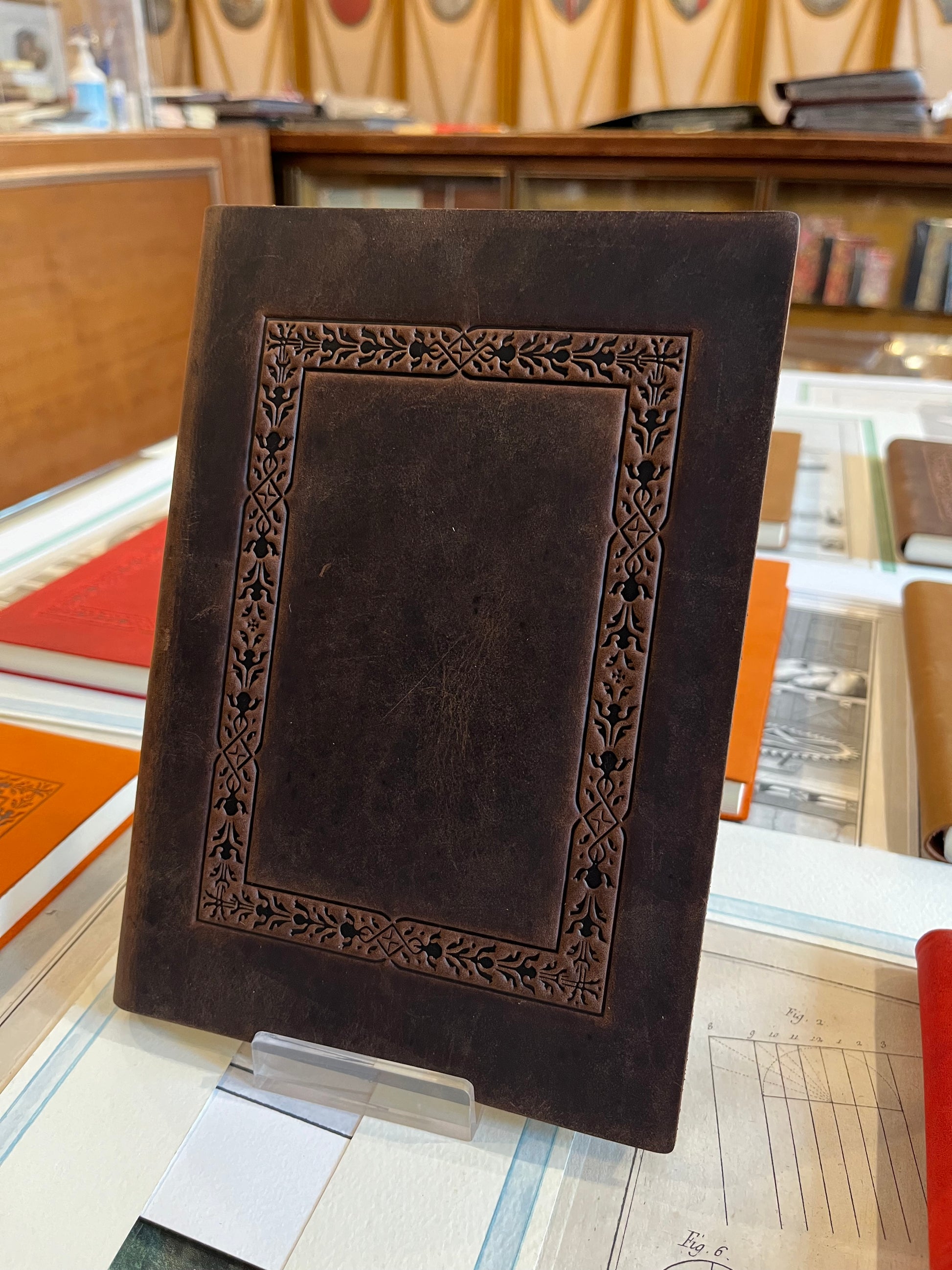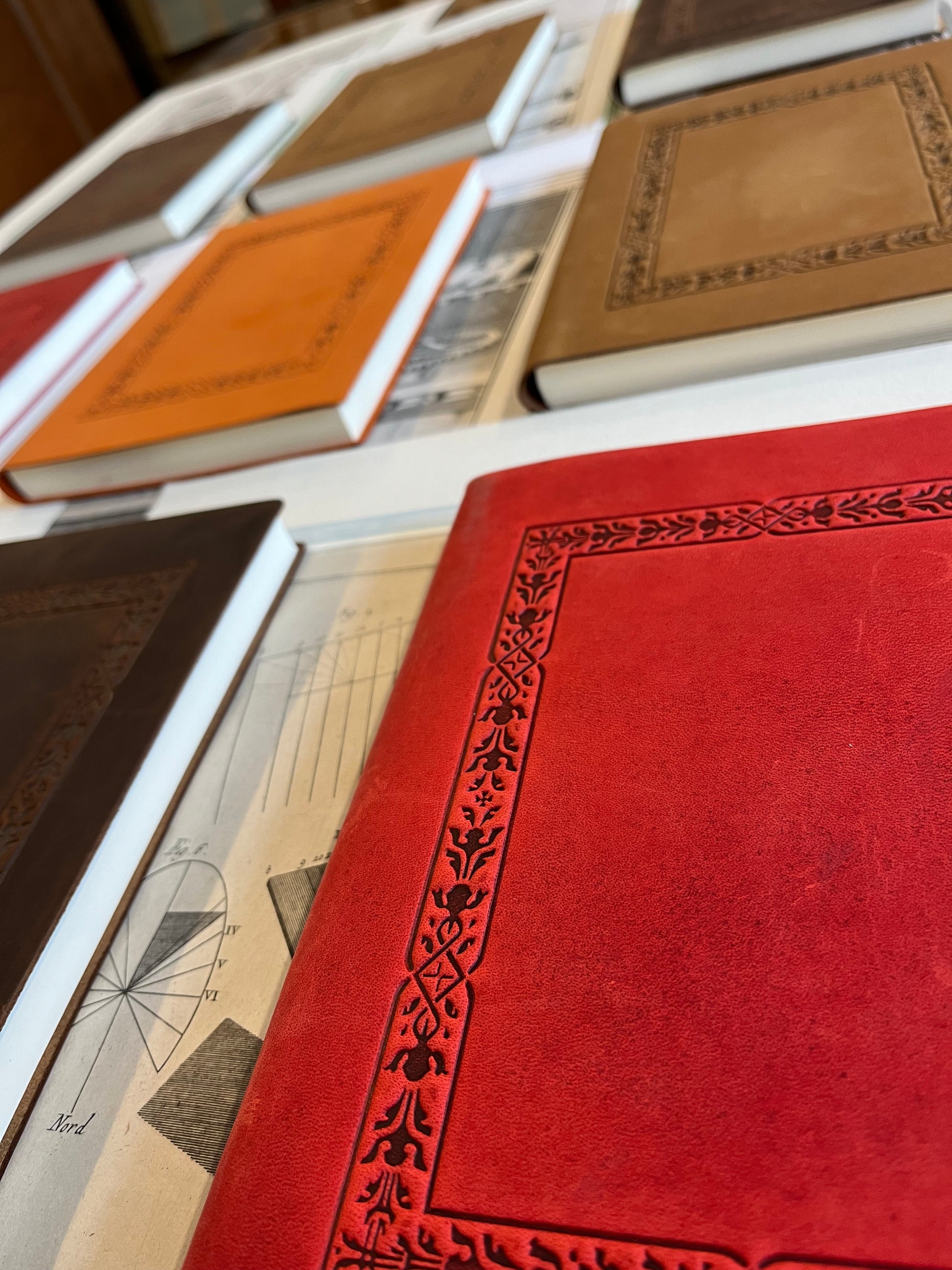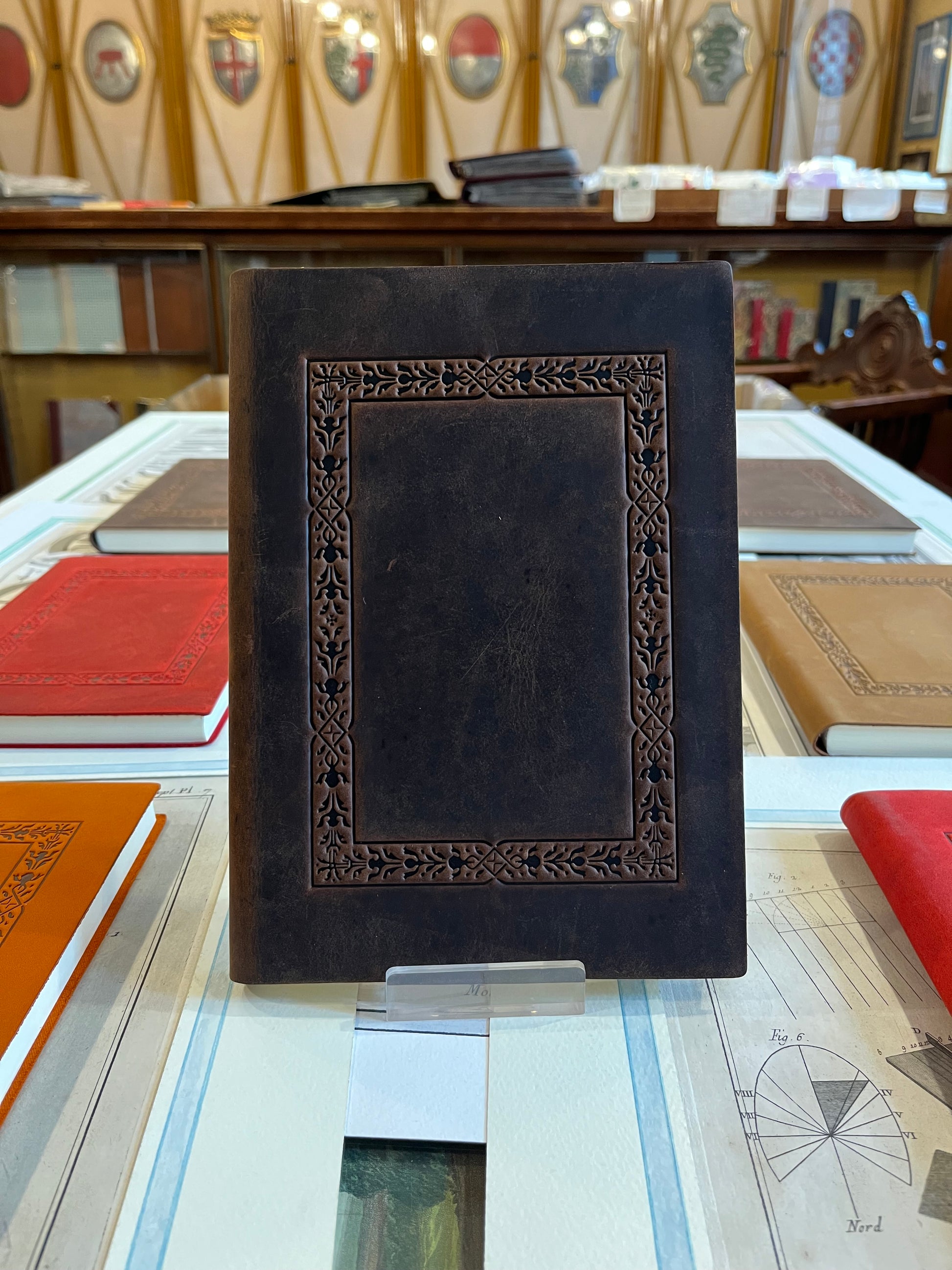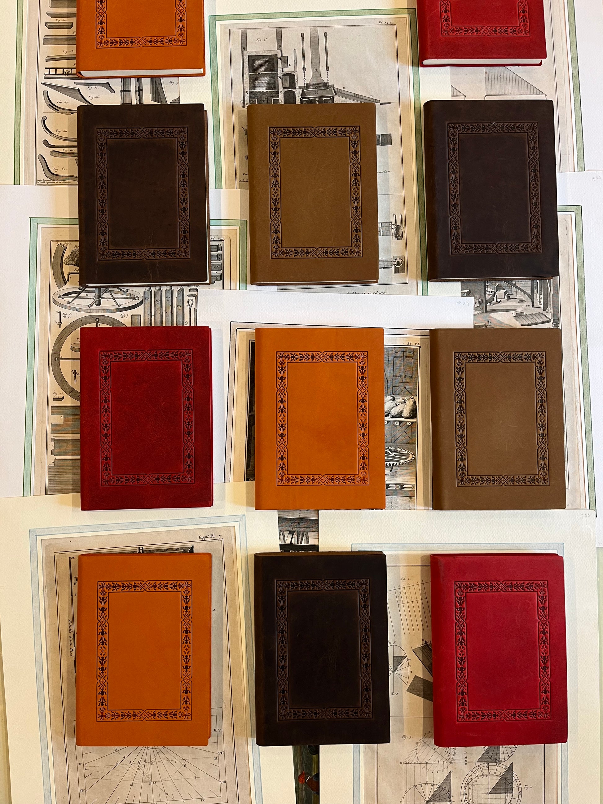 Copertina in pelle morbida italiana lavorata a caldo con fantasia geometrica, 120 pagine bianche.