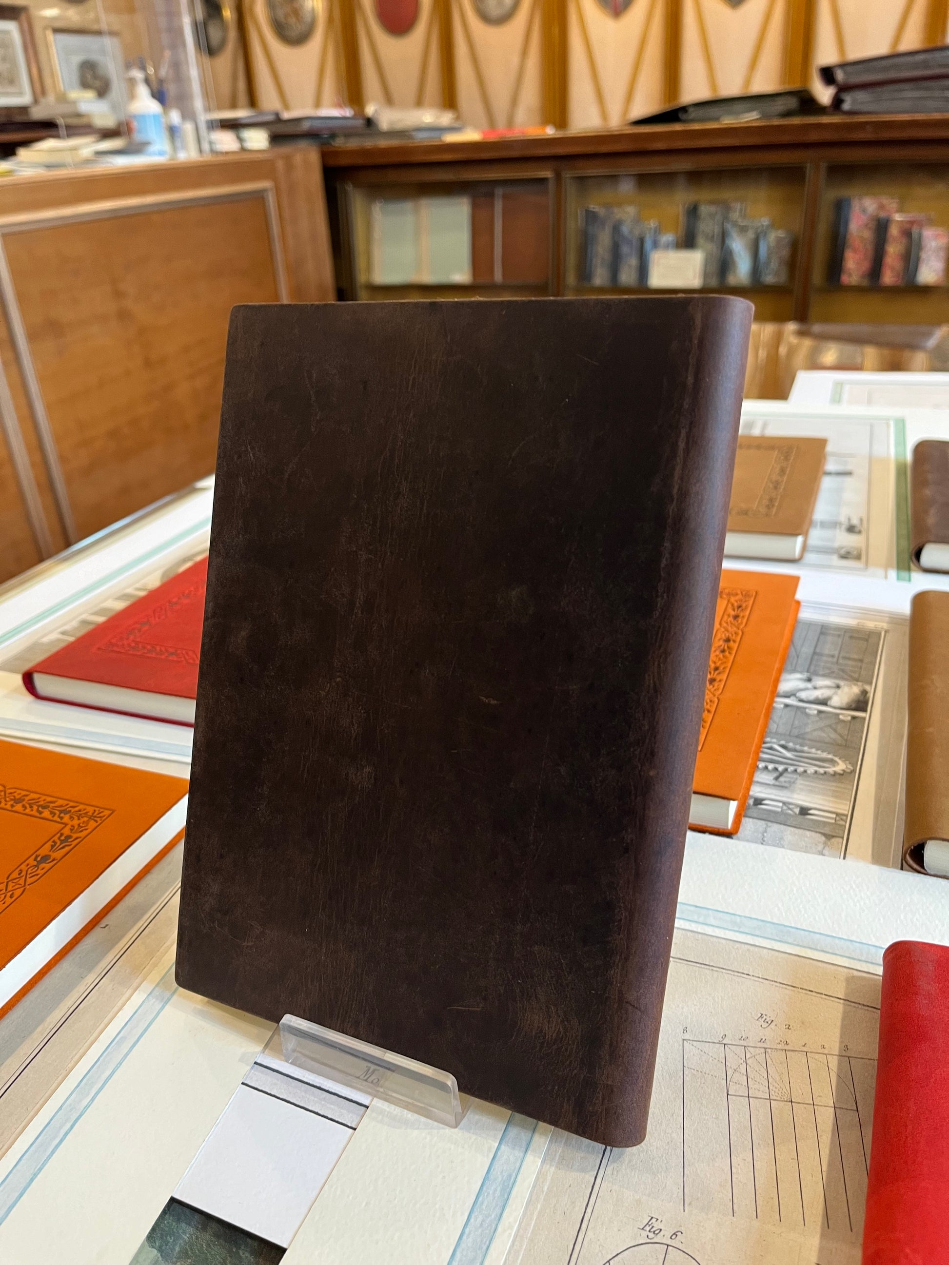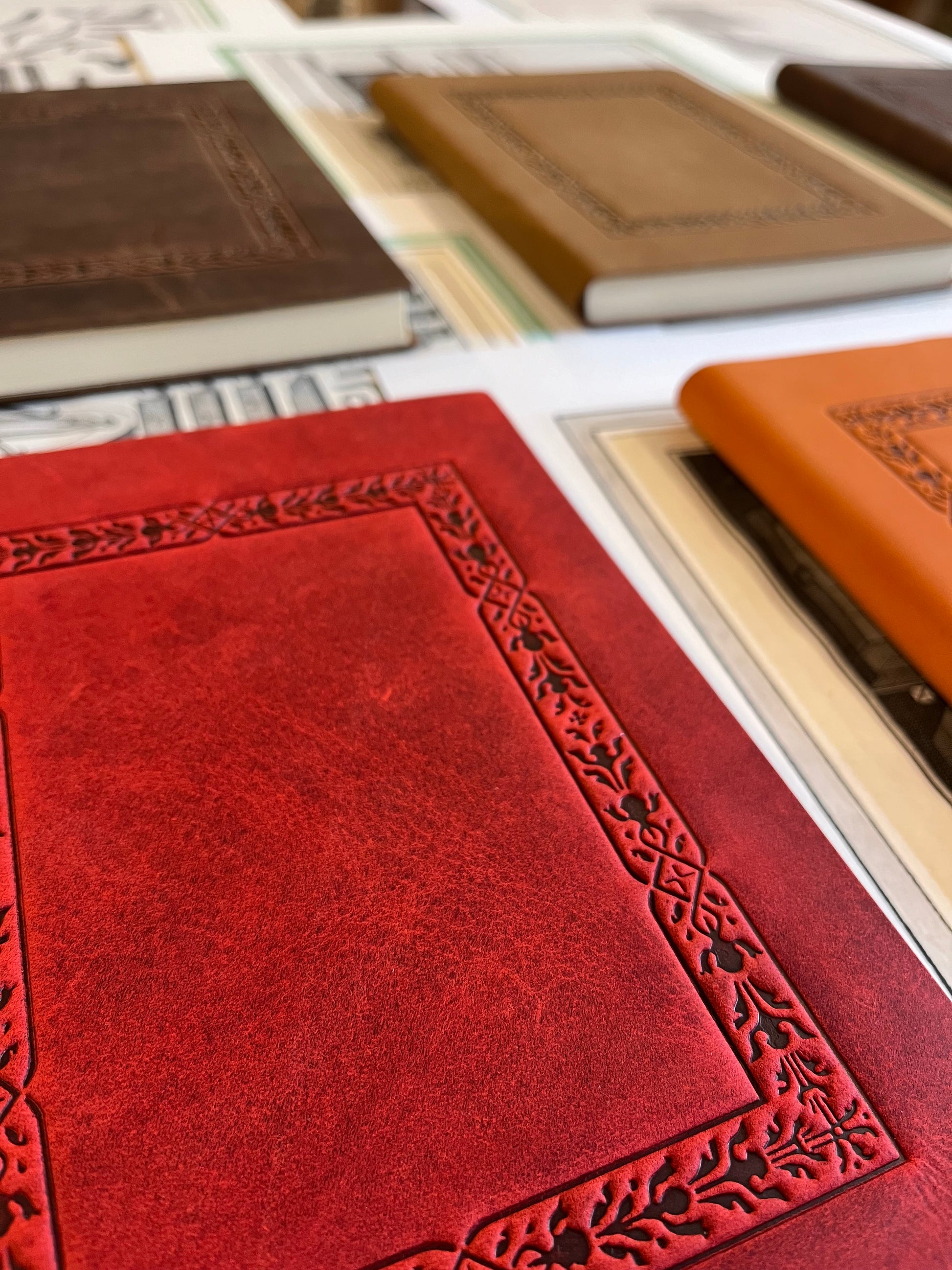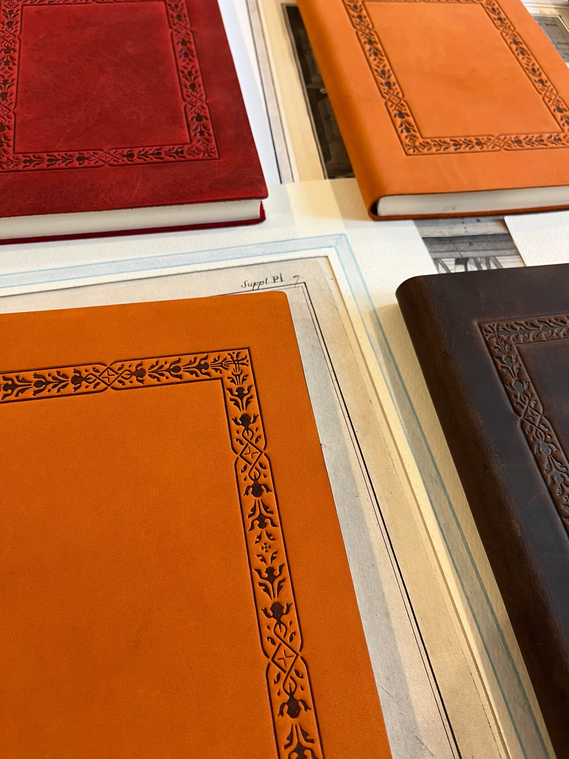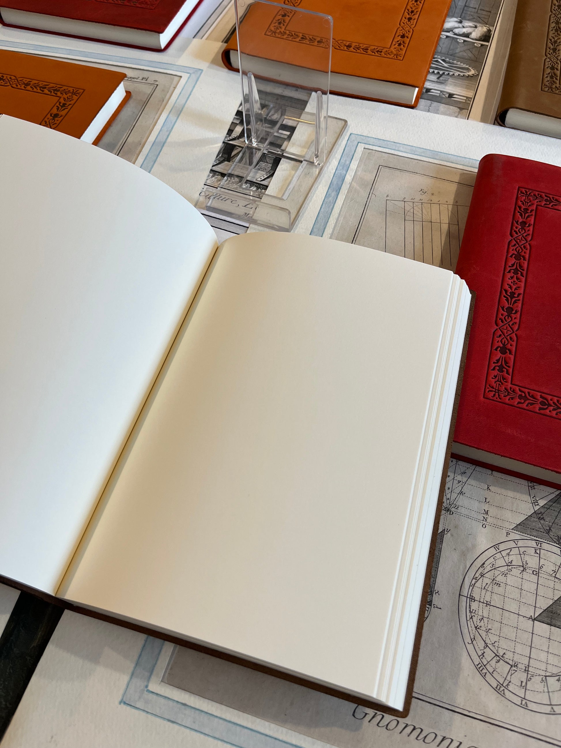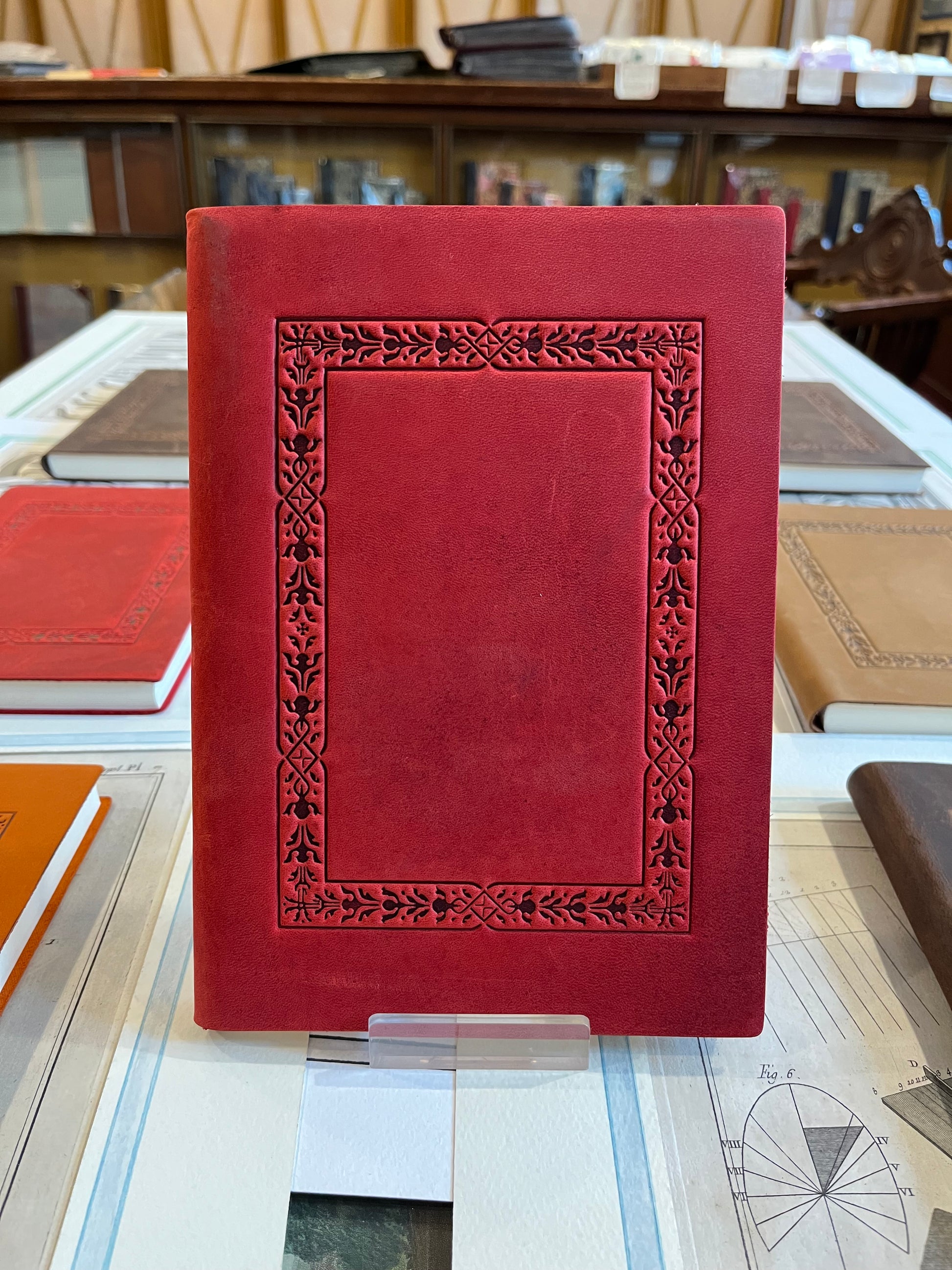 Copertina in pelle morbida italiana lavorata a caldo con fantasia geometrica, 120 pagine bianche.