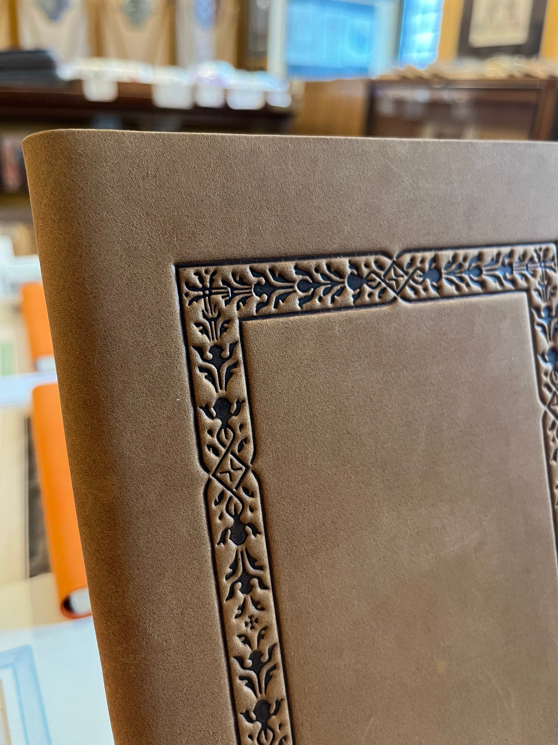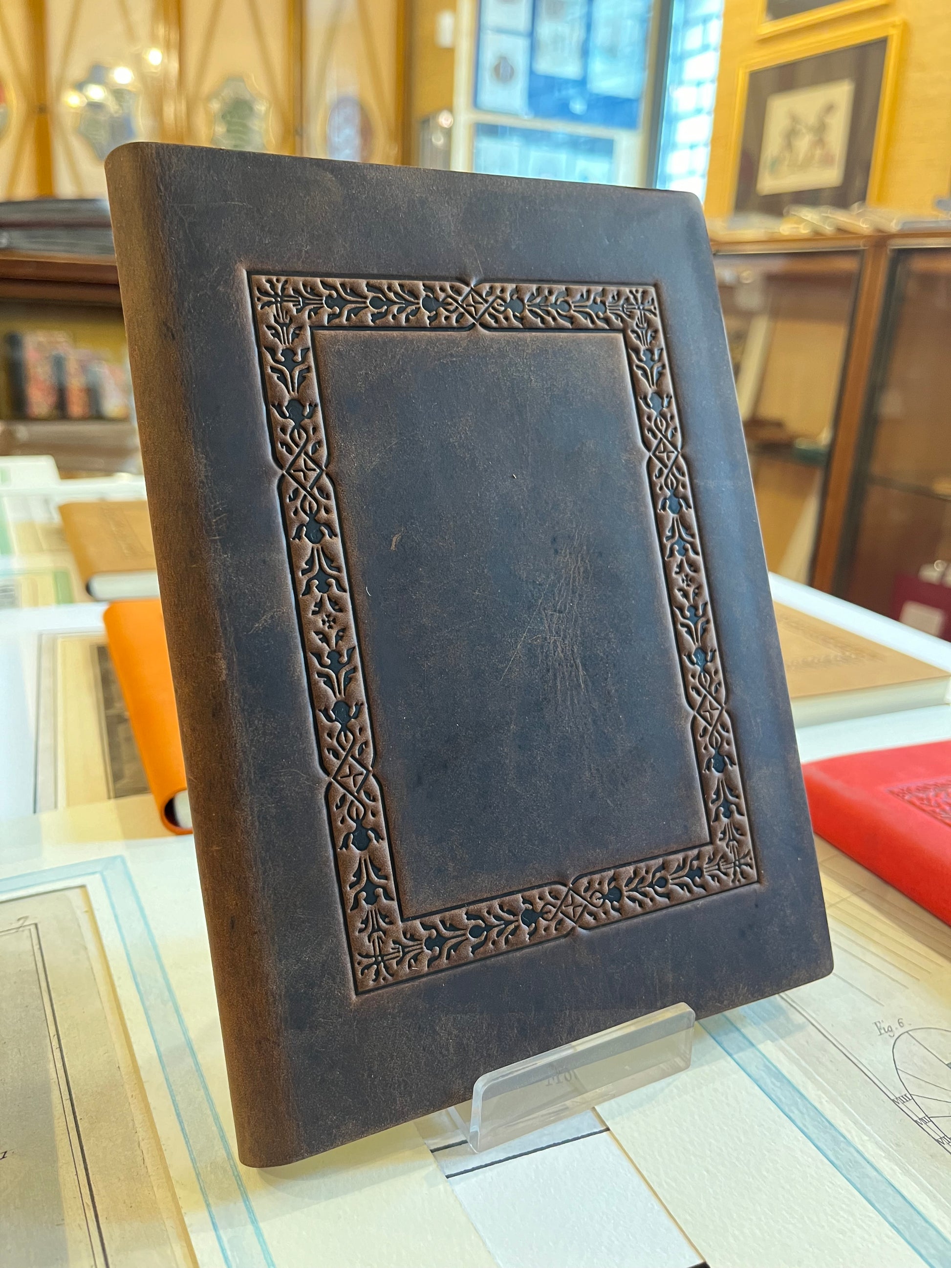 Quaderno 120 pagine bianche, copertina in pelle con cornice lavorata - 14,5 x 21 cm