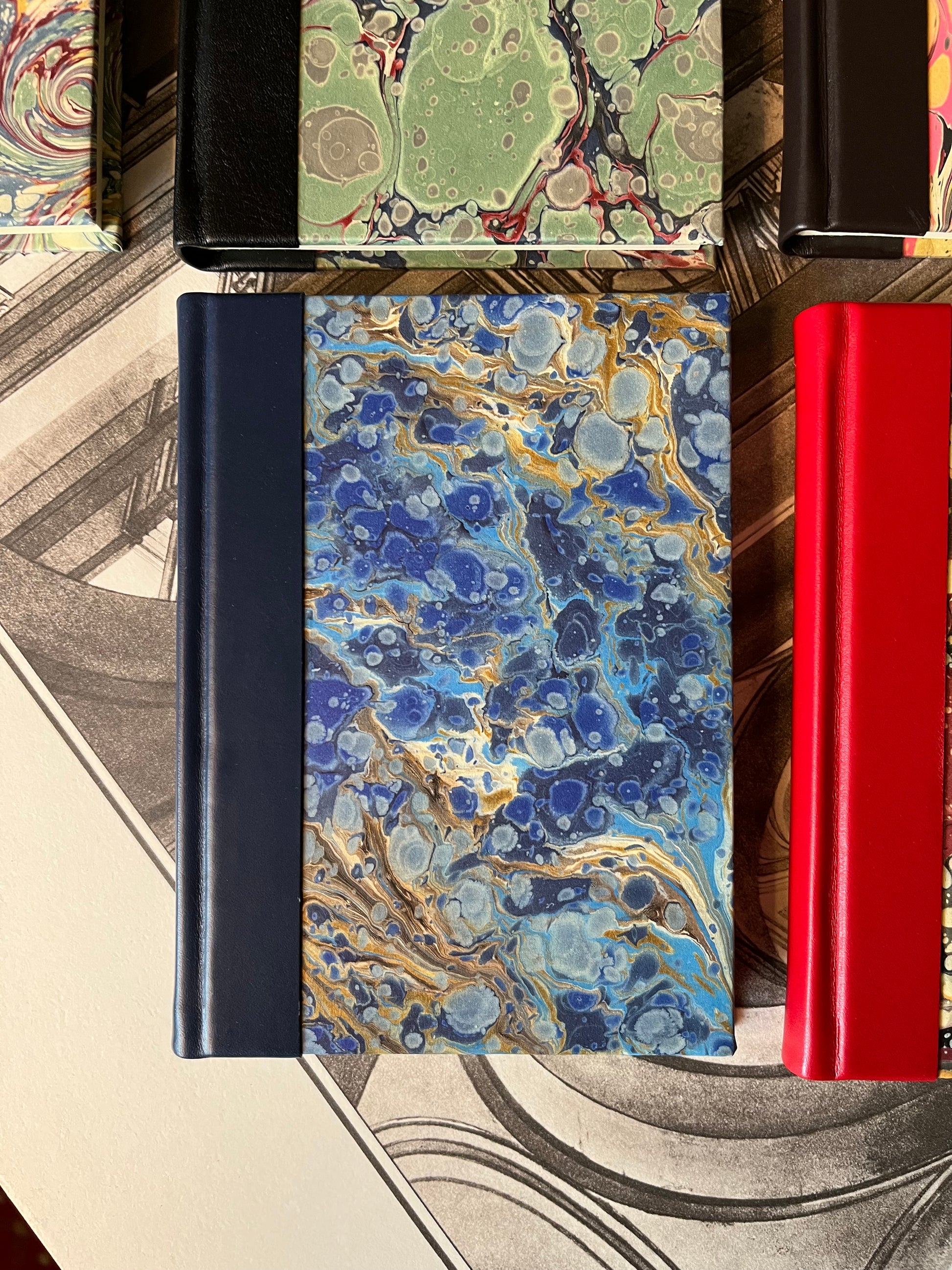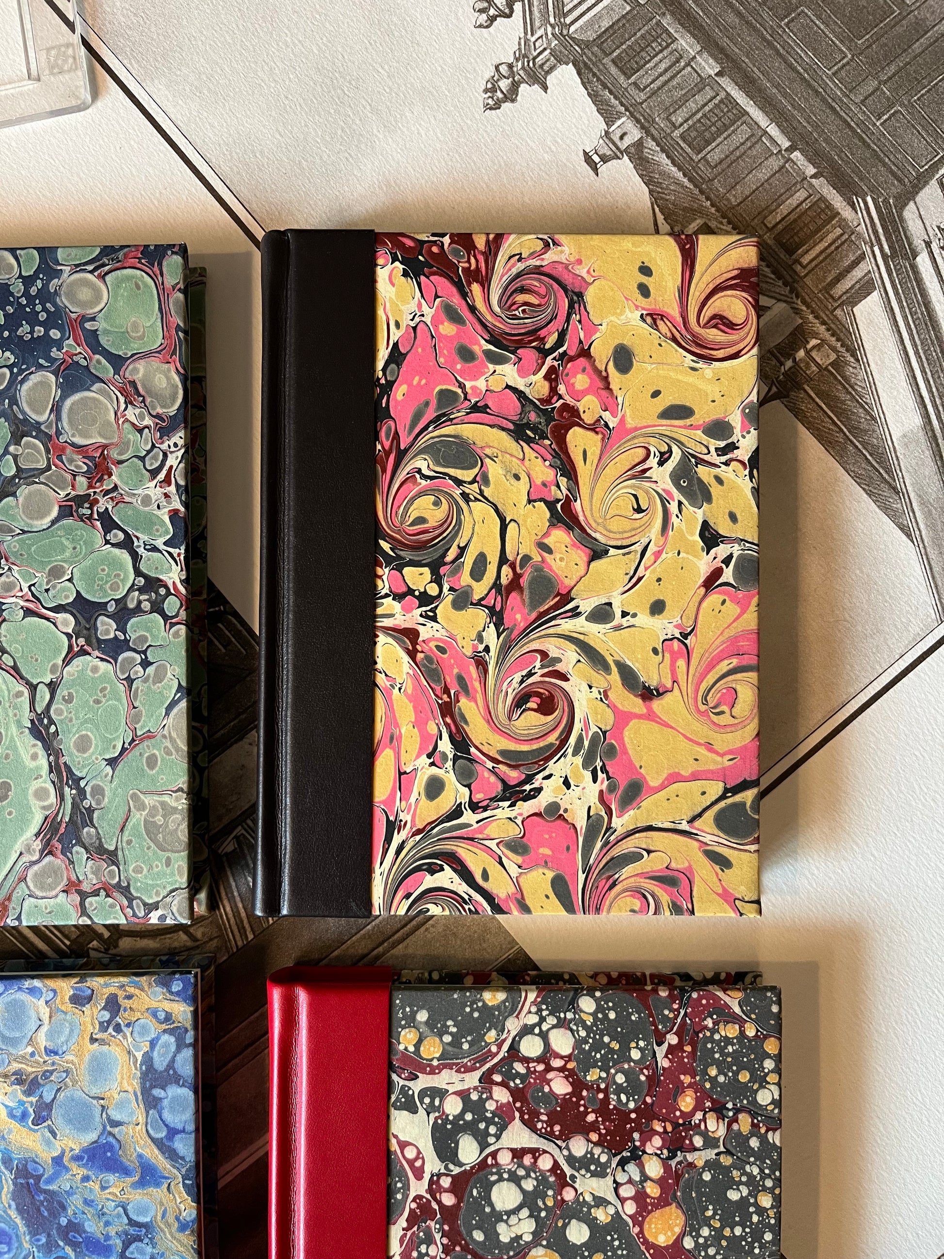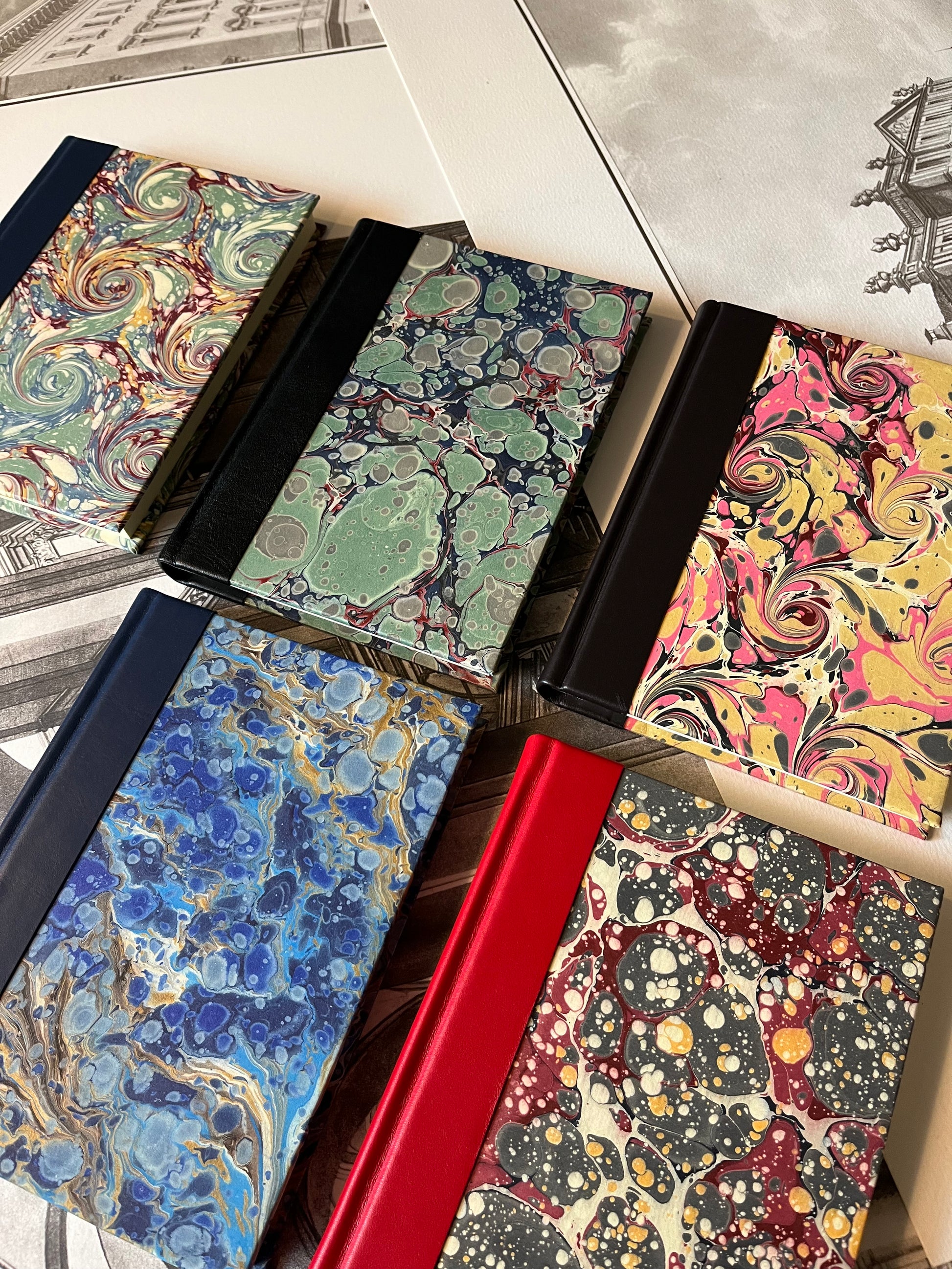 Copertina rigida rivestita con carta marmorizzata, dorso in pelle italiana. 80 pagine bianche, realizzato interamente a mano, diversi colori.
