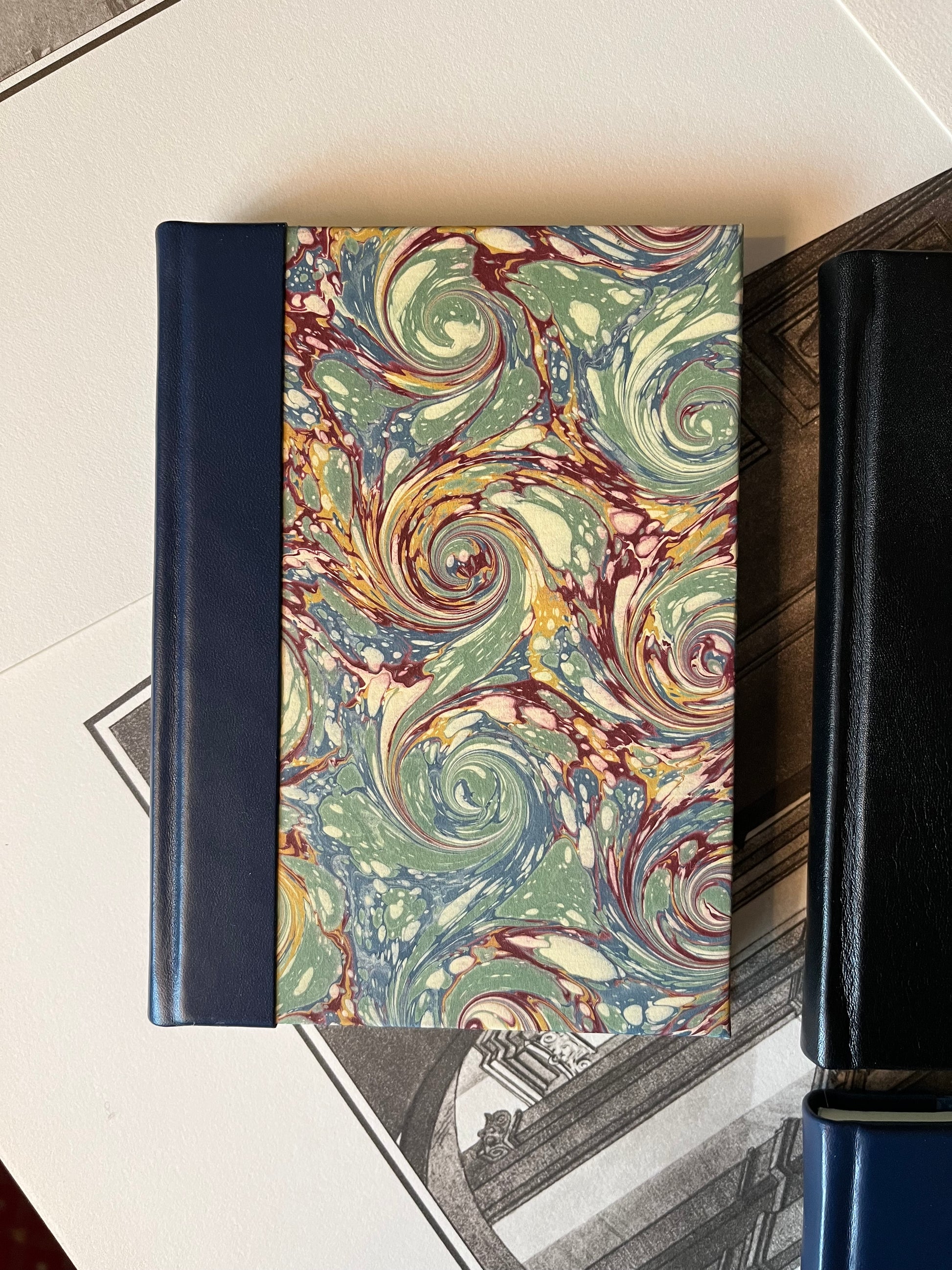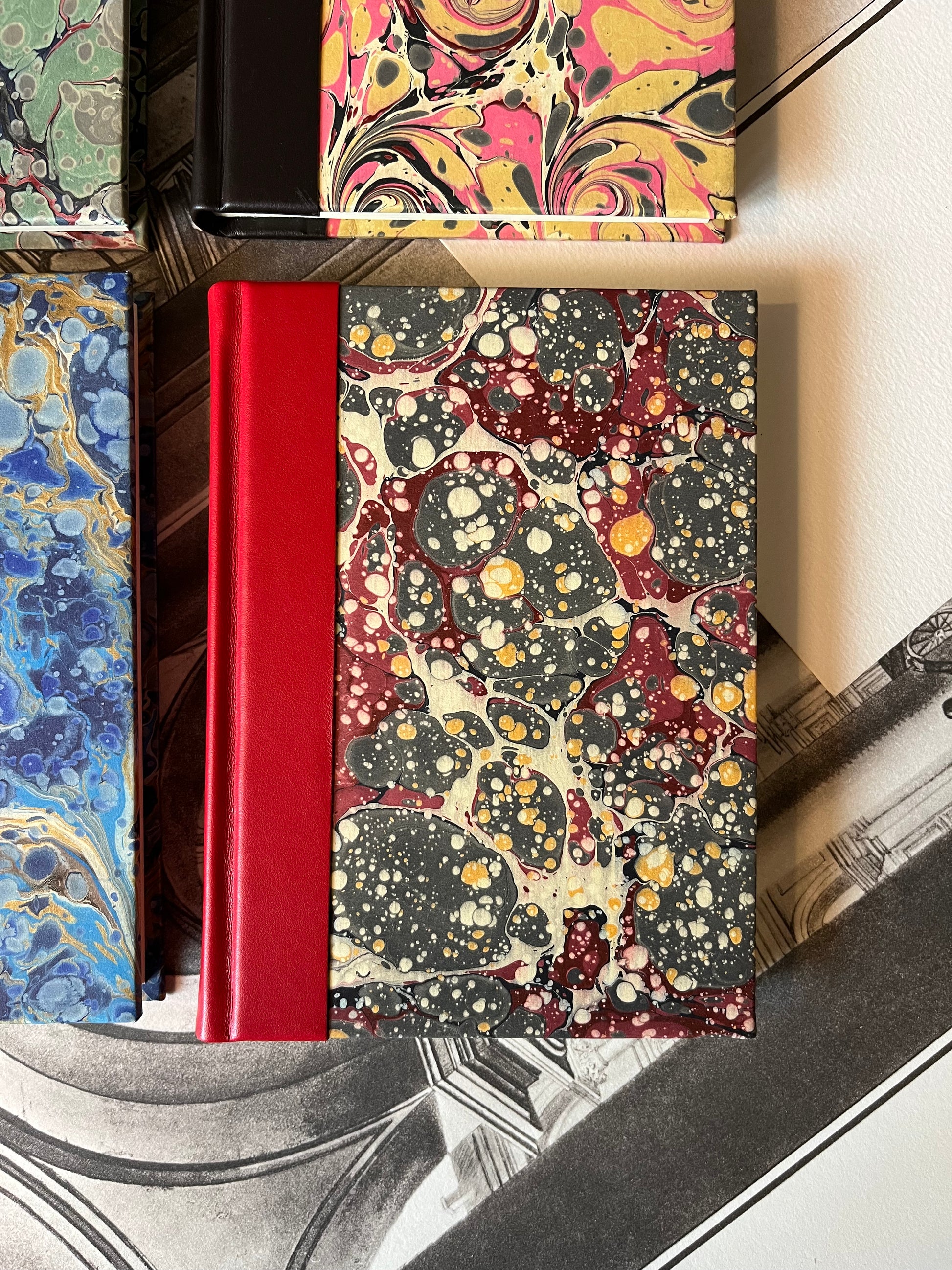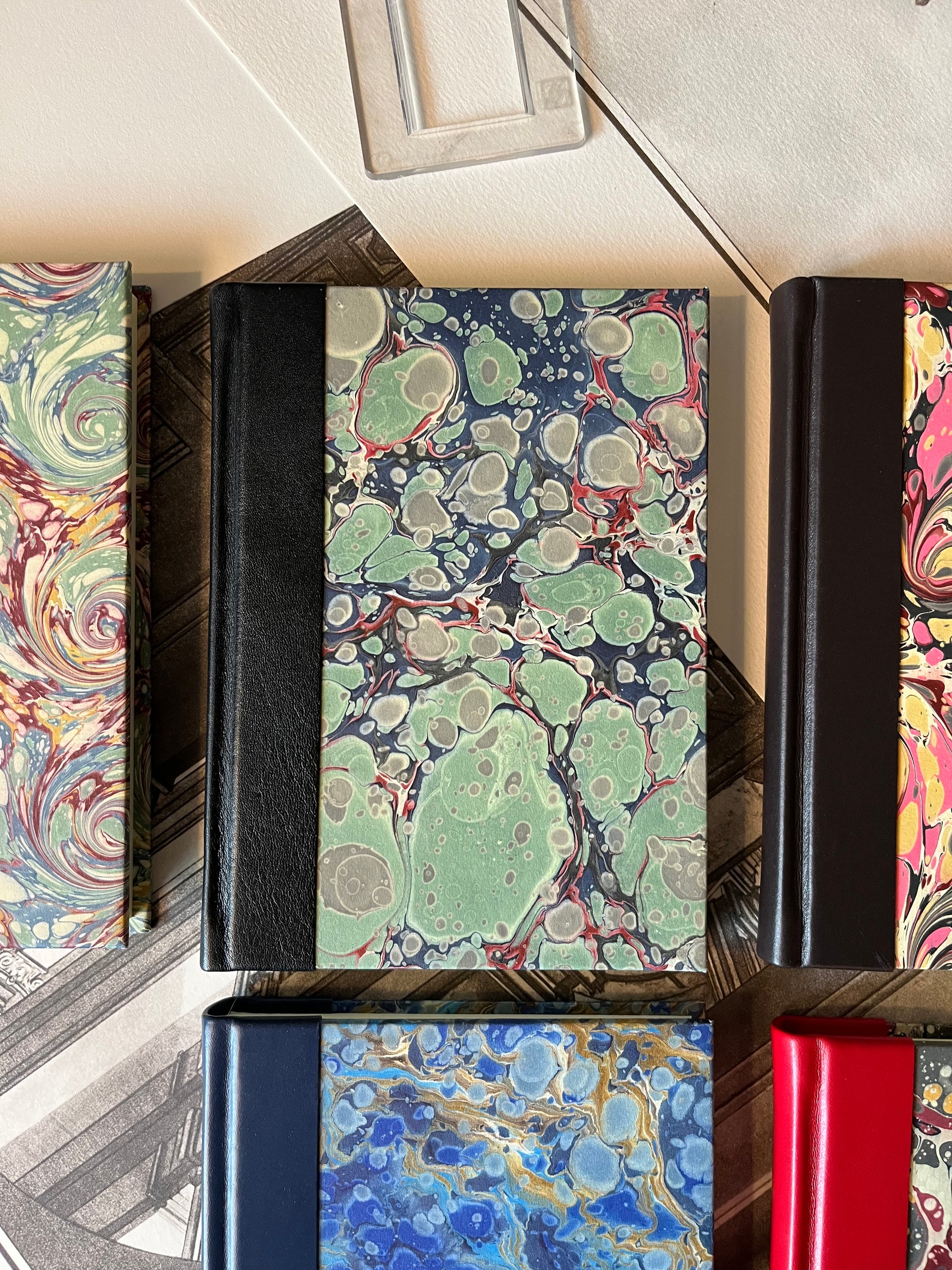 Copertina rigida rivestita con carta marmorizzata, dorso in pelle italiana. 80 pagine bianche, realizzato interamente a mano, diversi colori.
