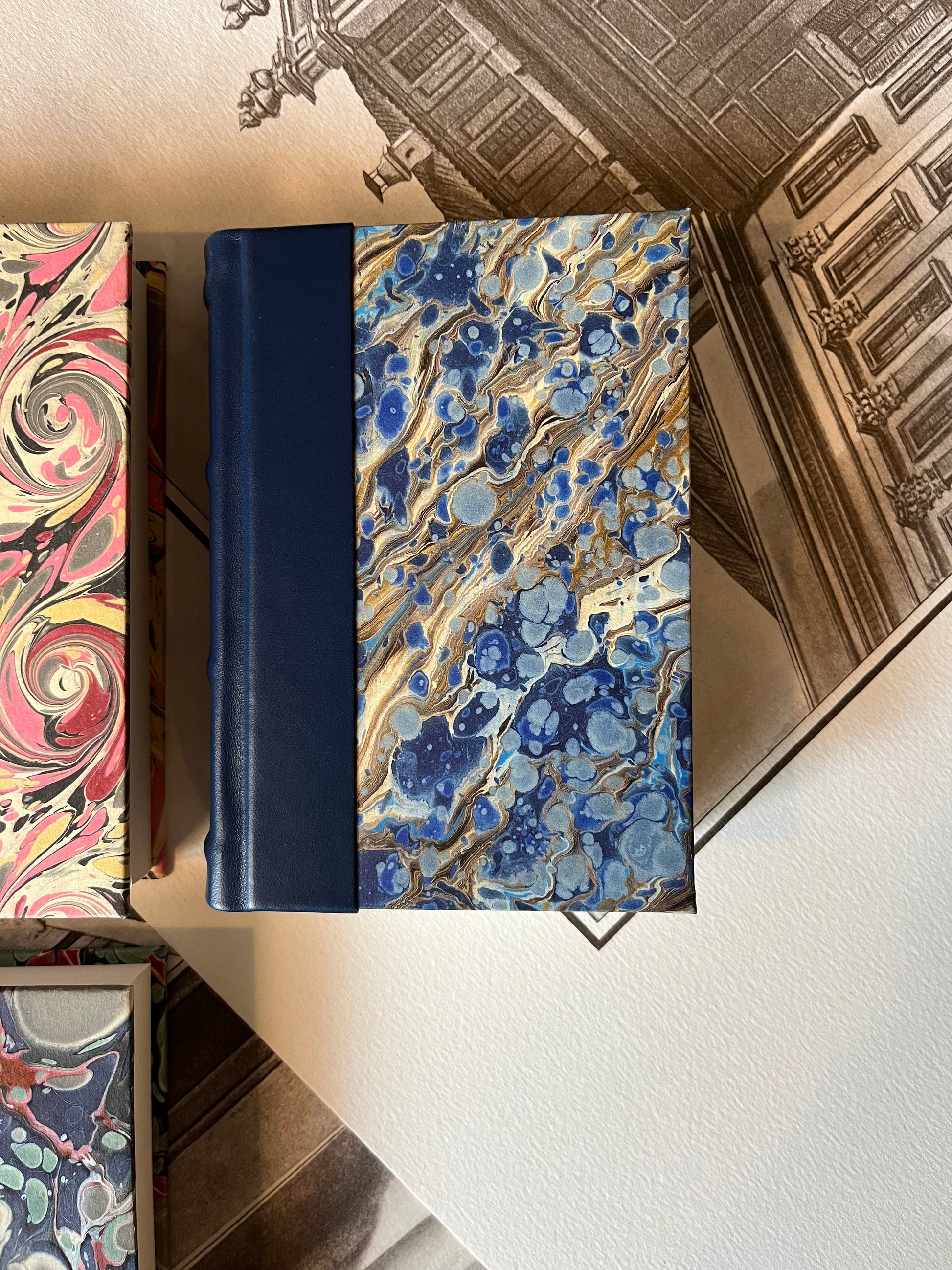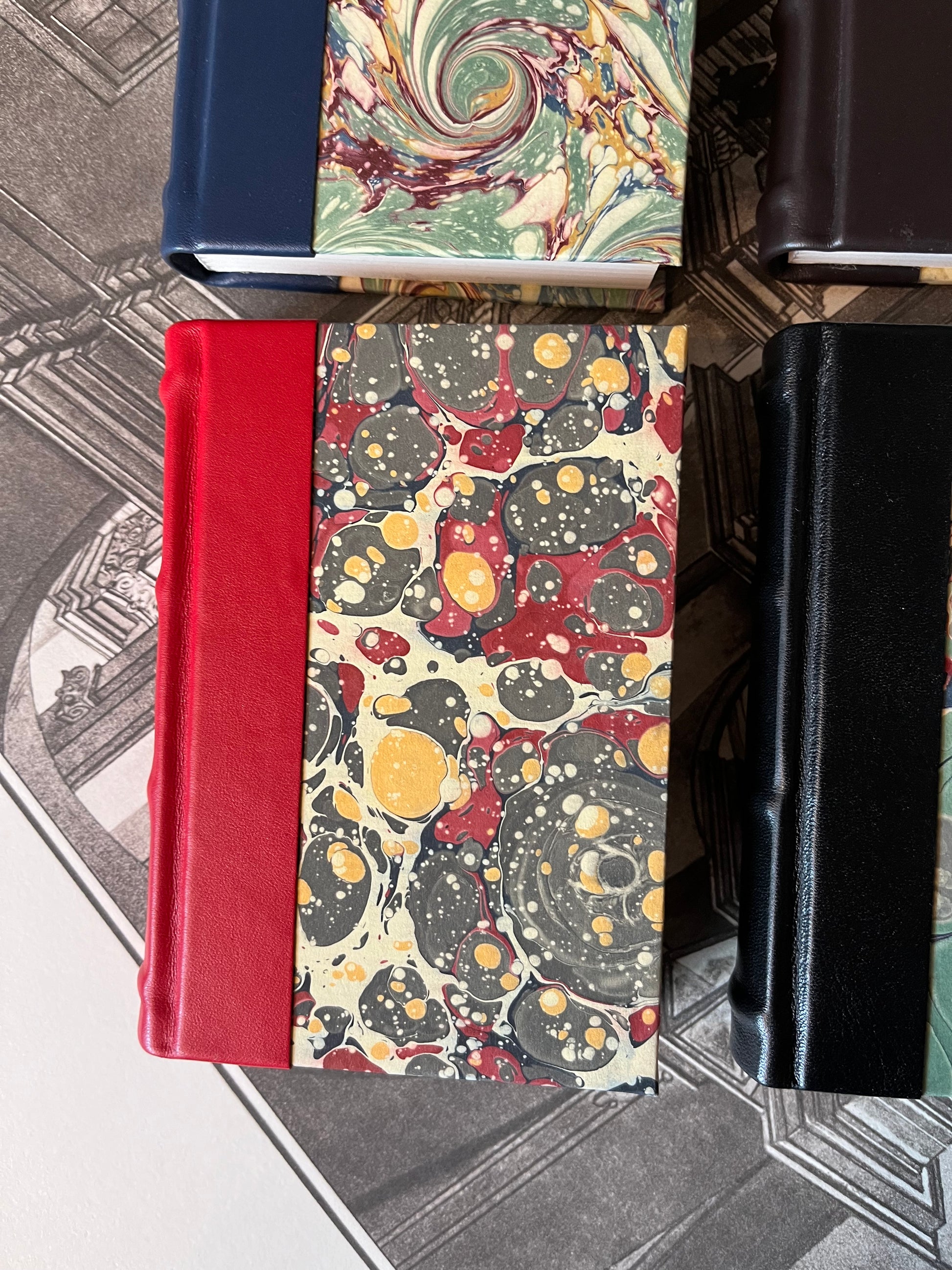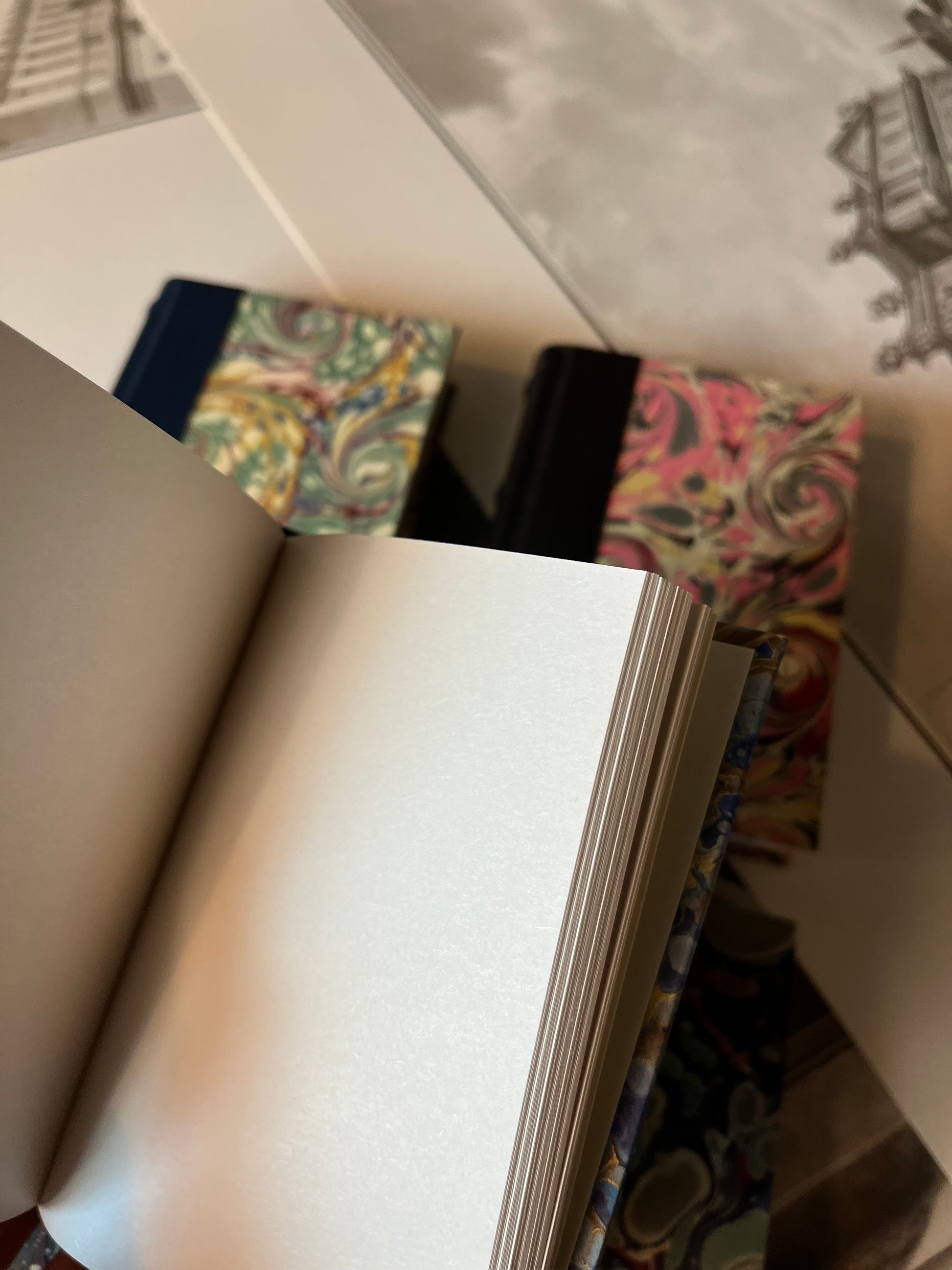 Copertina rigida rivestita con carta marmorizzata, dorso in pelle italiana. 110 pagine bianche, realizzato interamente a mano, diversi colori.