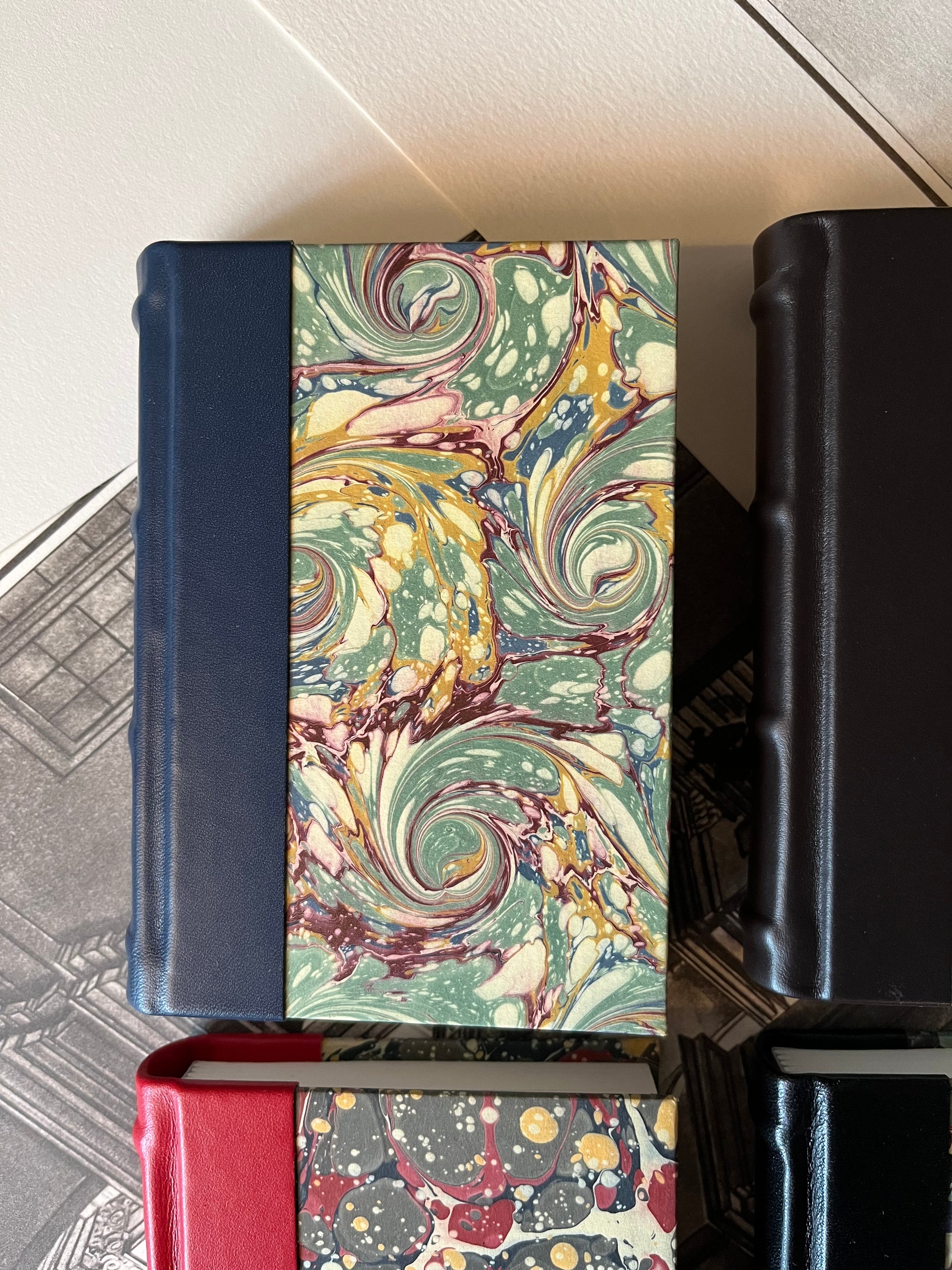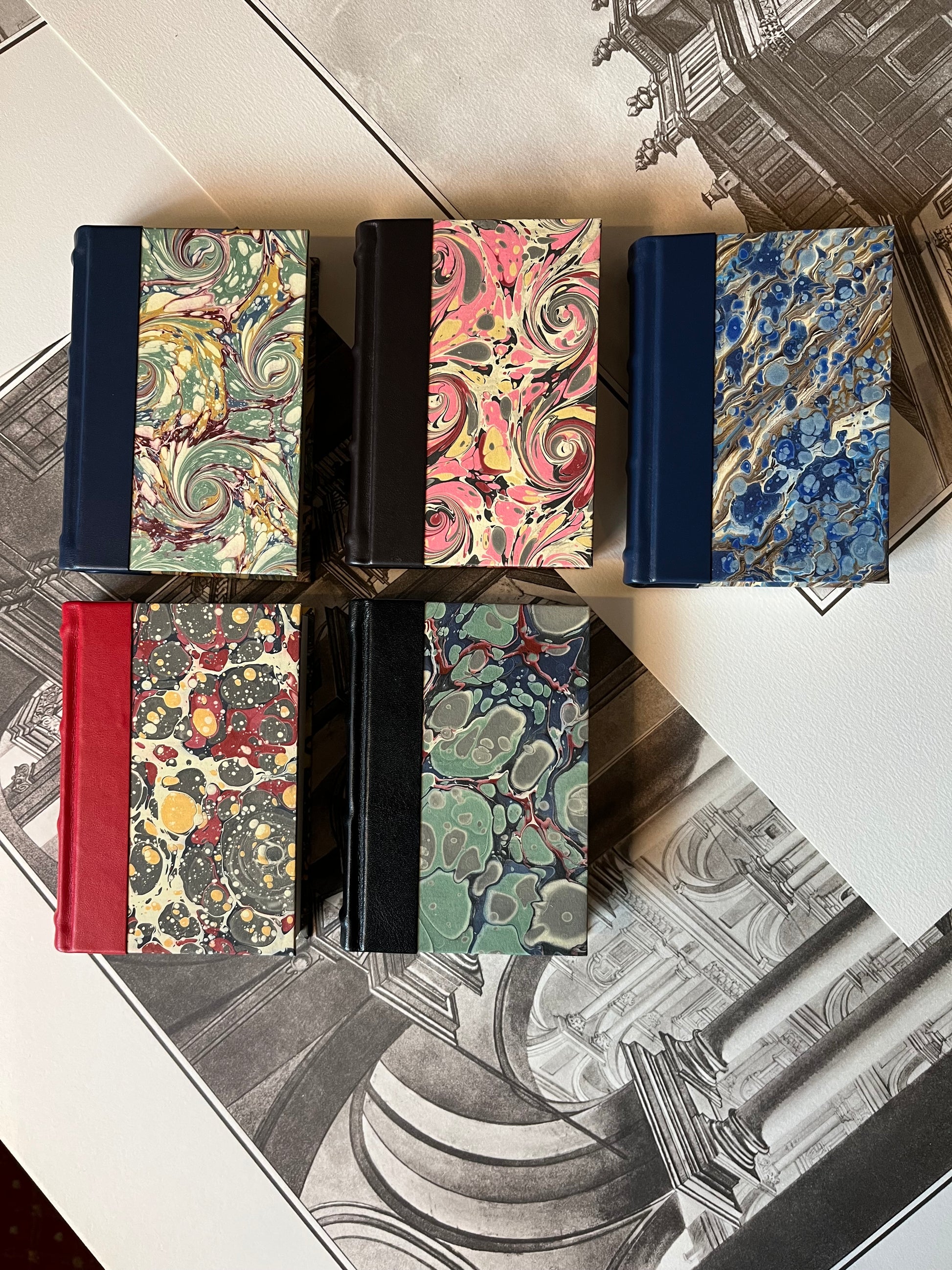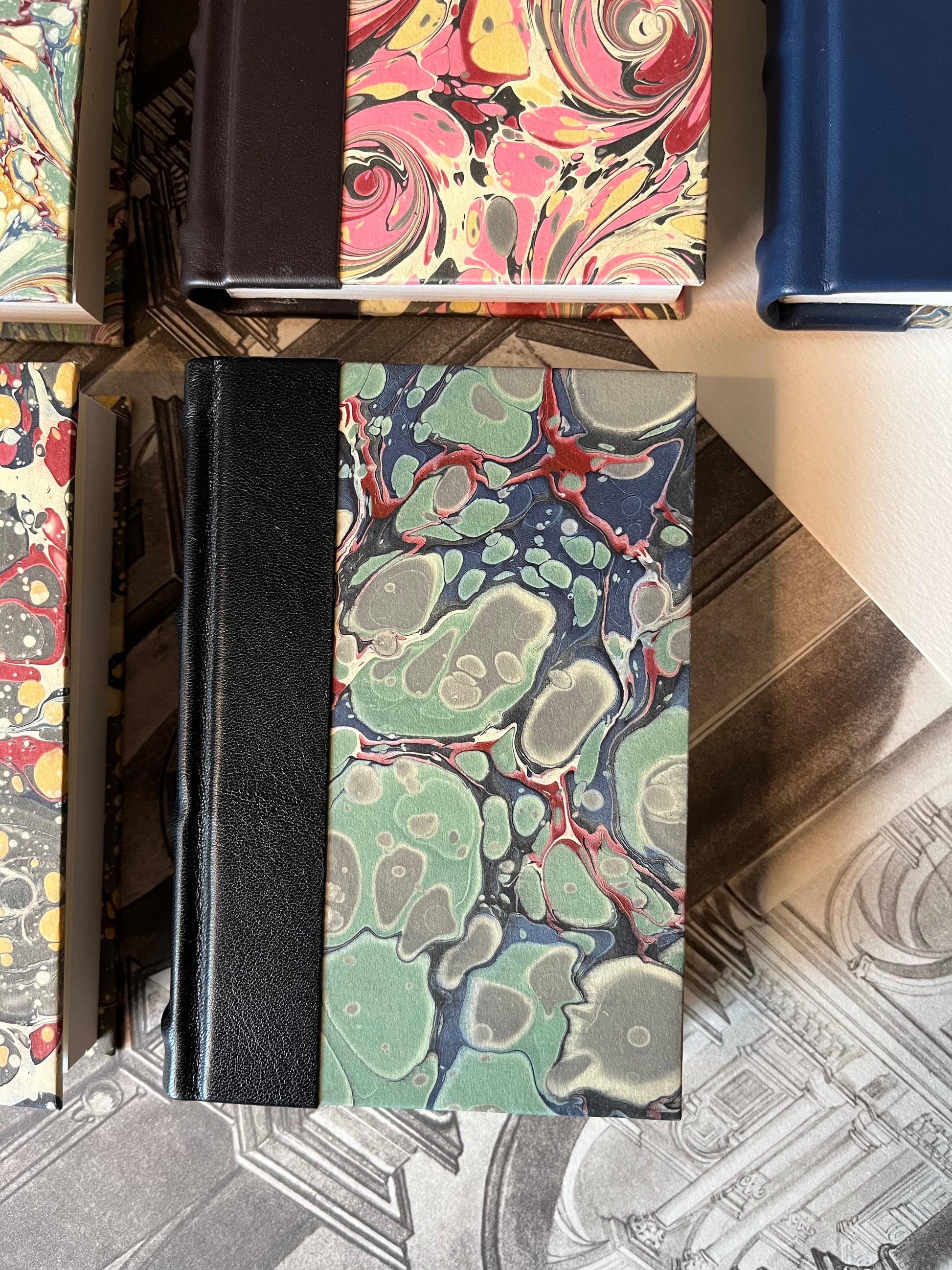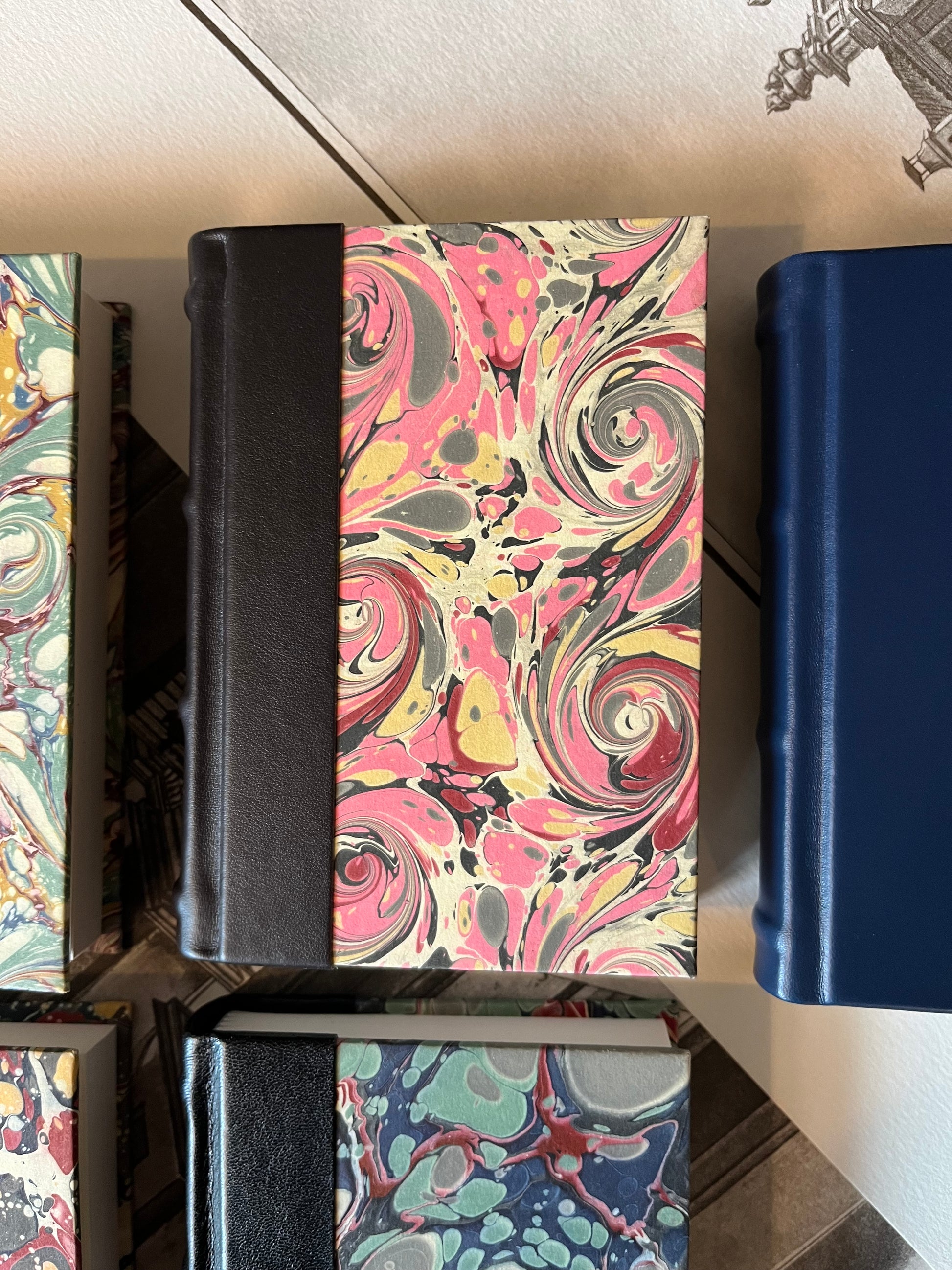 Copertina rigida rivestita con carta marmorizzata, dorso in pelle italiana. 110 pagine bianche, realizzato interamente a mano, diversi colori.