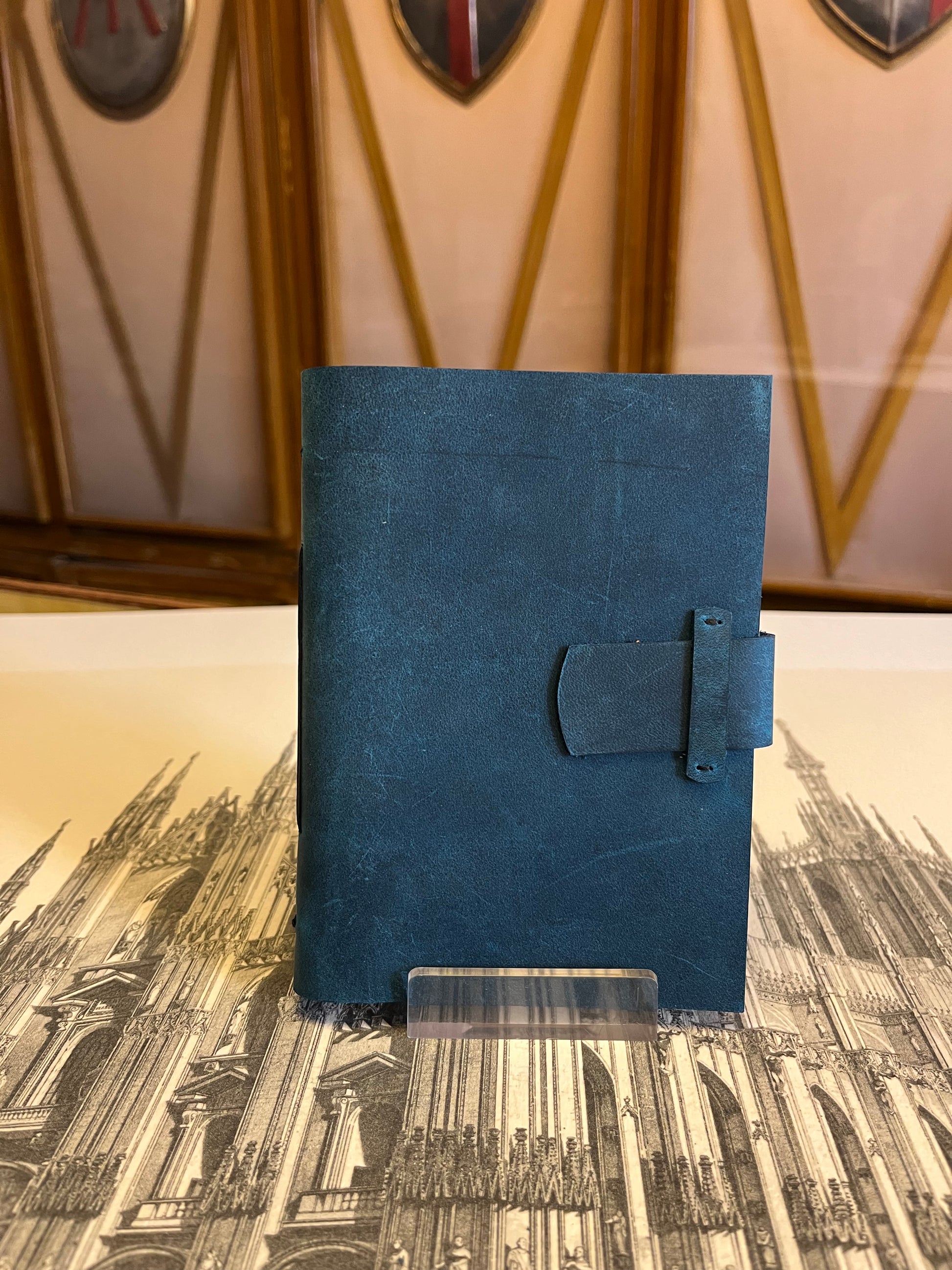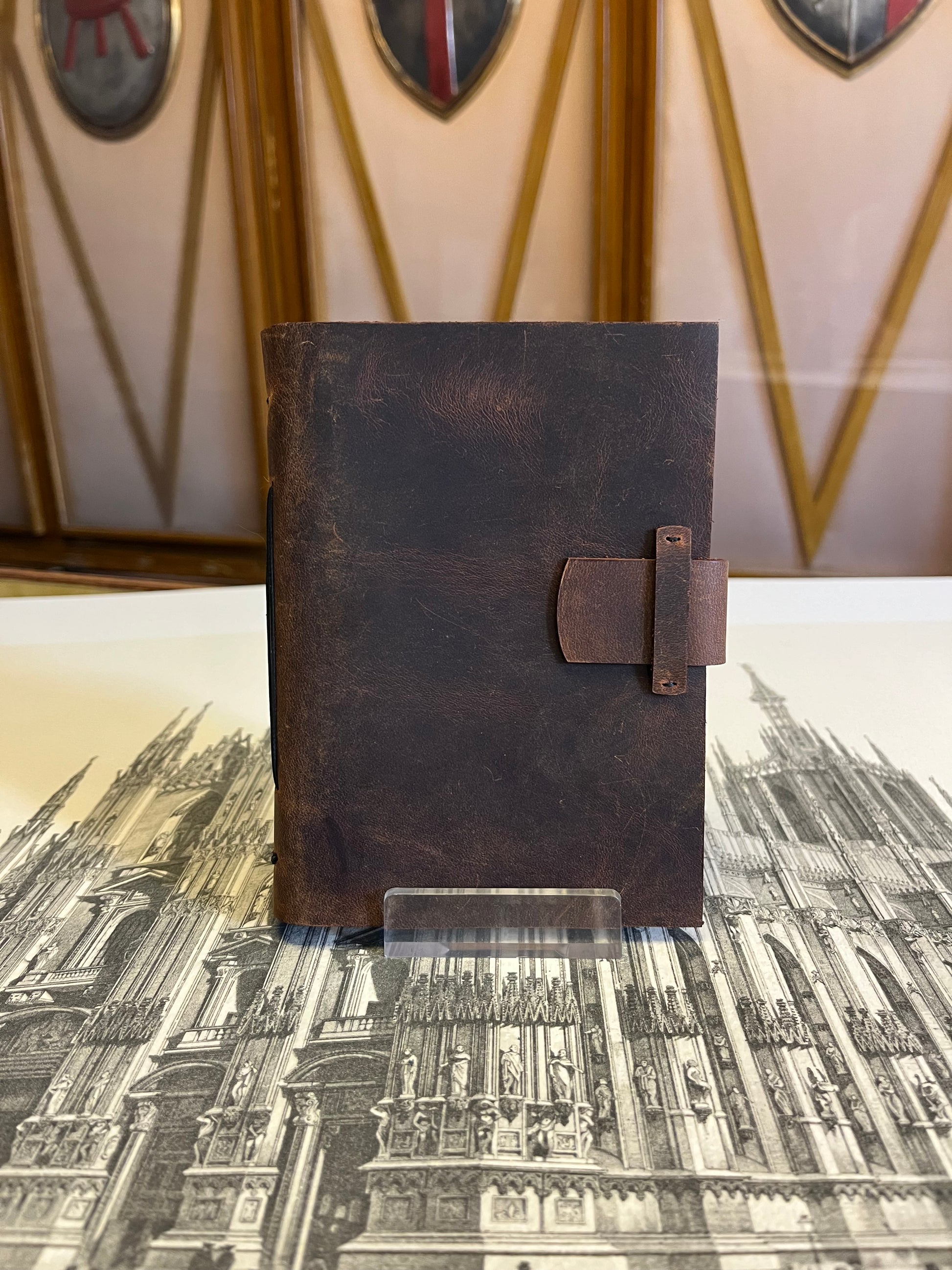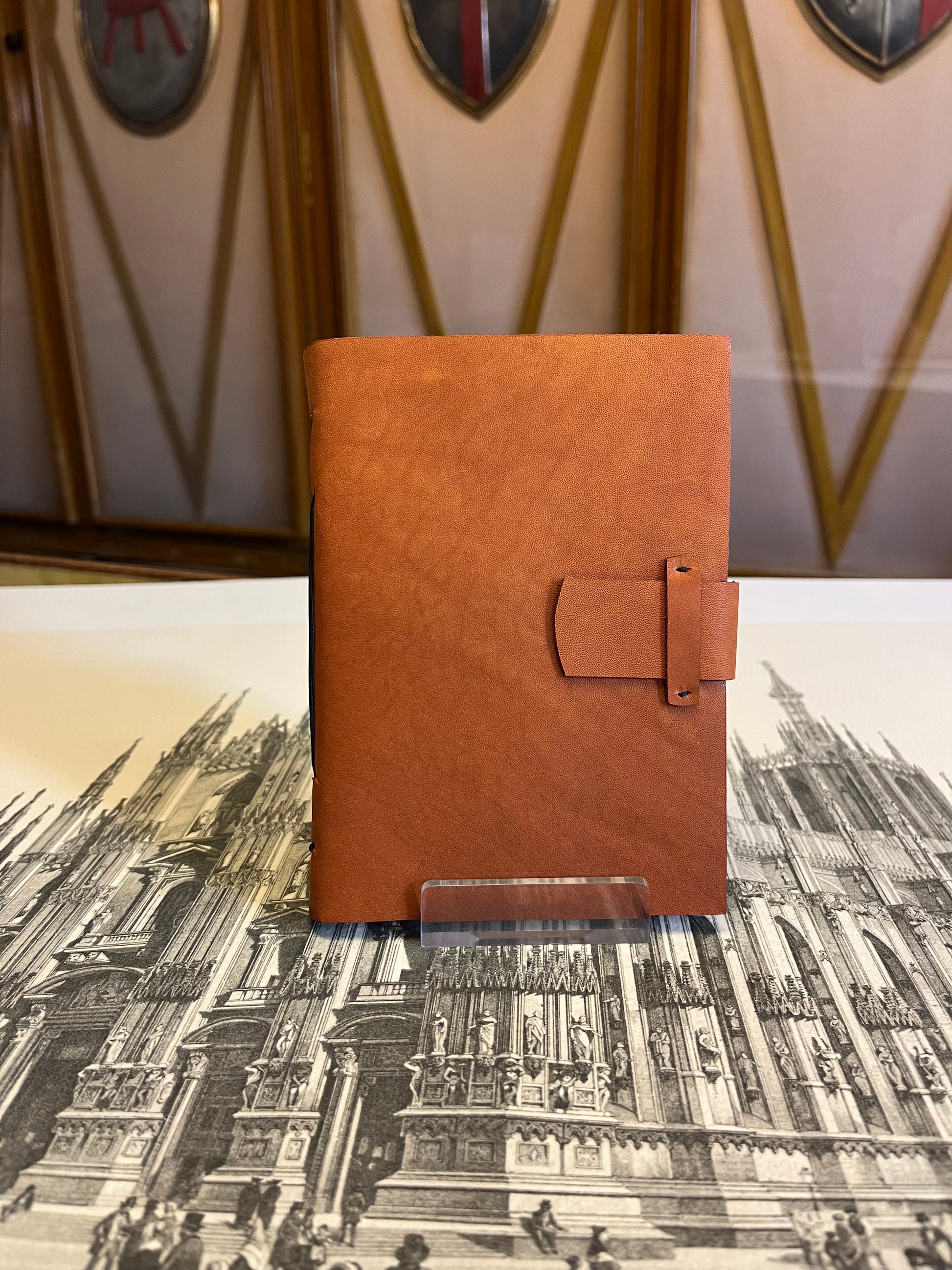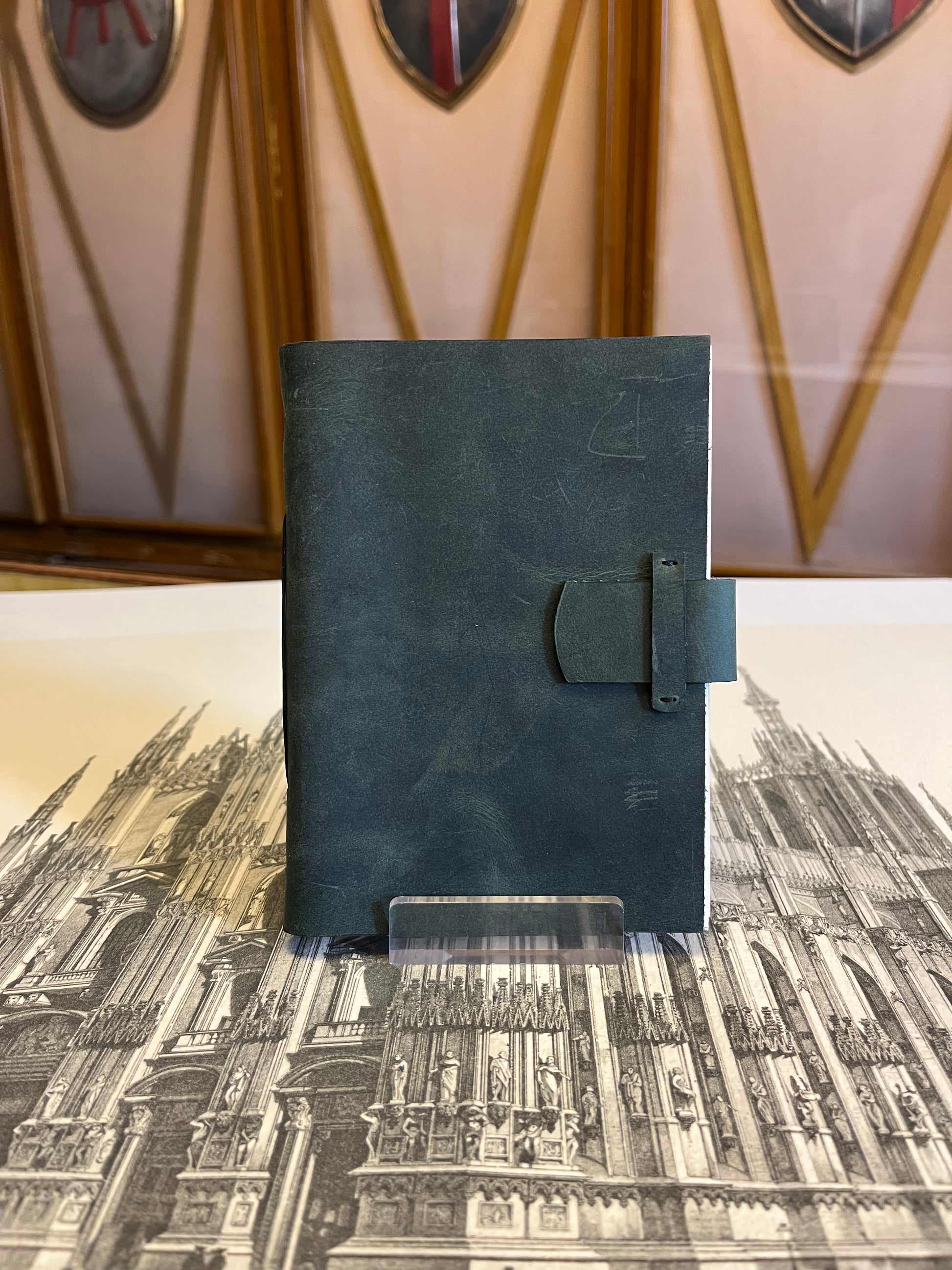 Copertina in pelle morbida, fascia di chiusura. 90 pagine bianche realizzate con carta riciclata e cucite a mano.