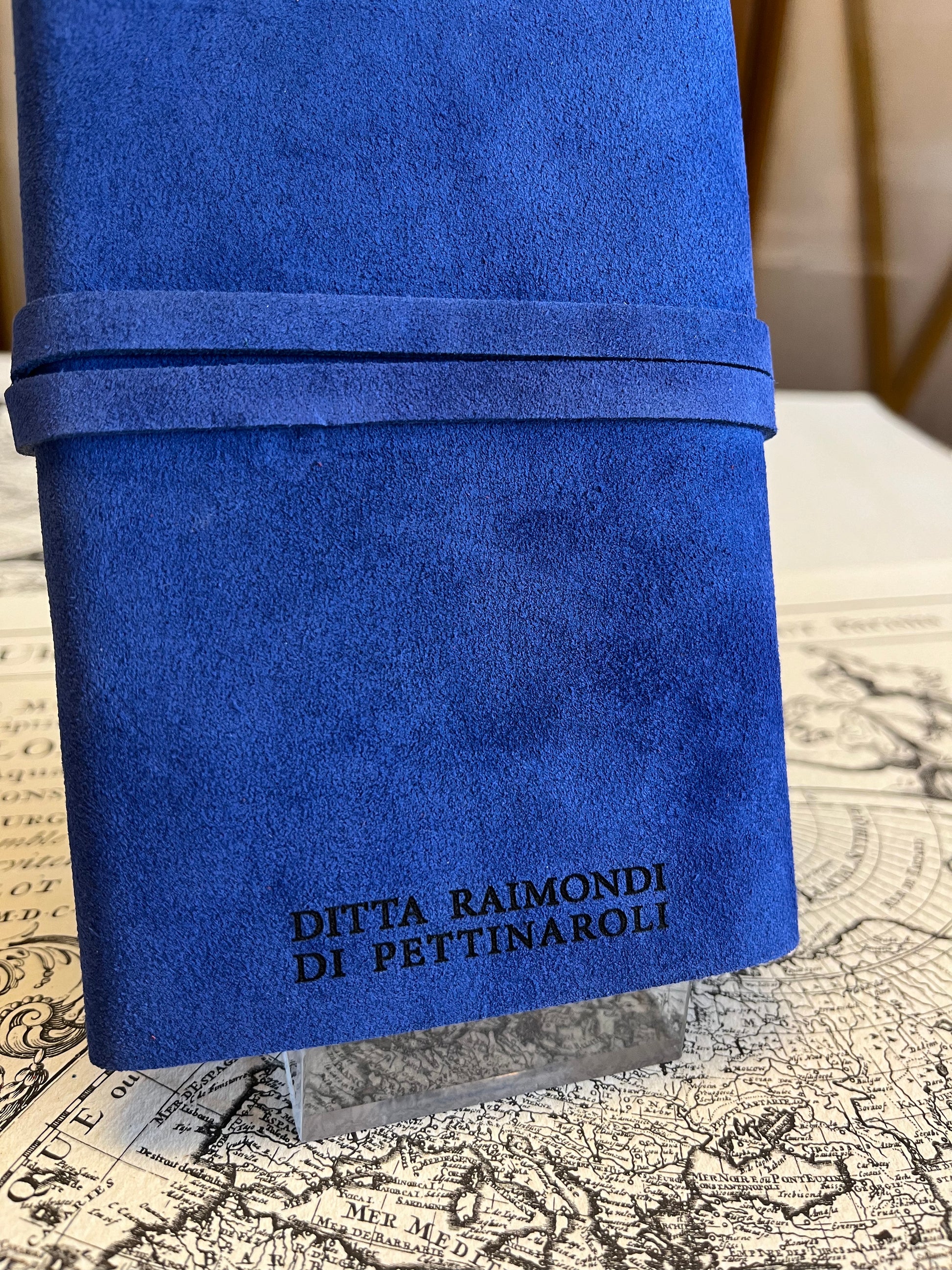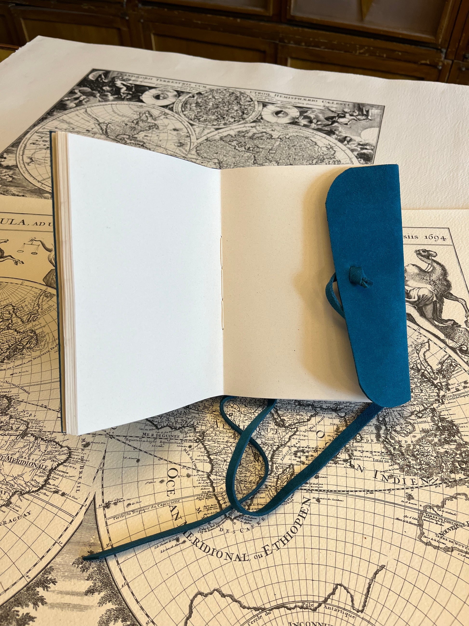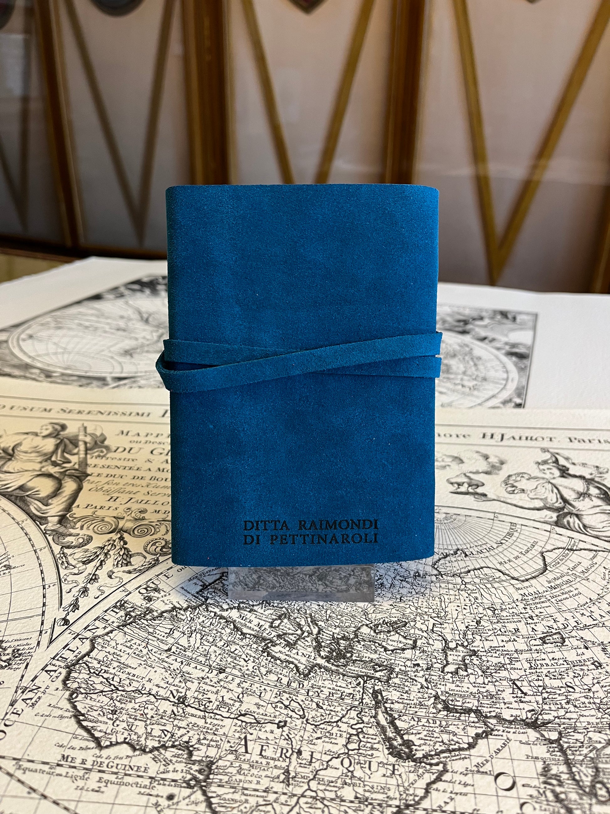 Copertina in pelle morbida scamosciata, laccetto di chiusura. 90 pagine bianche realizzate con carta riciclata e cucite a mano.